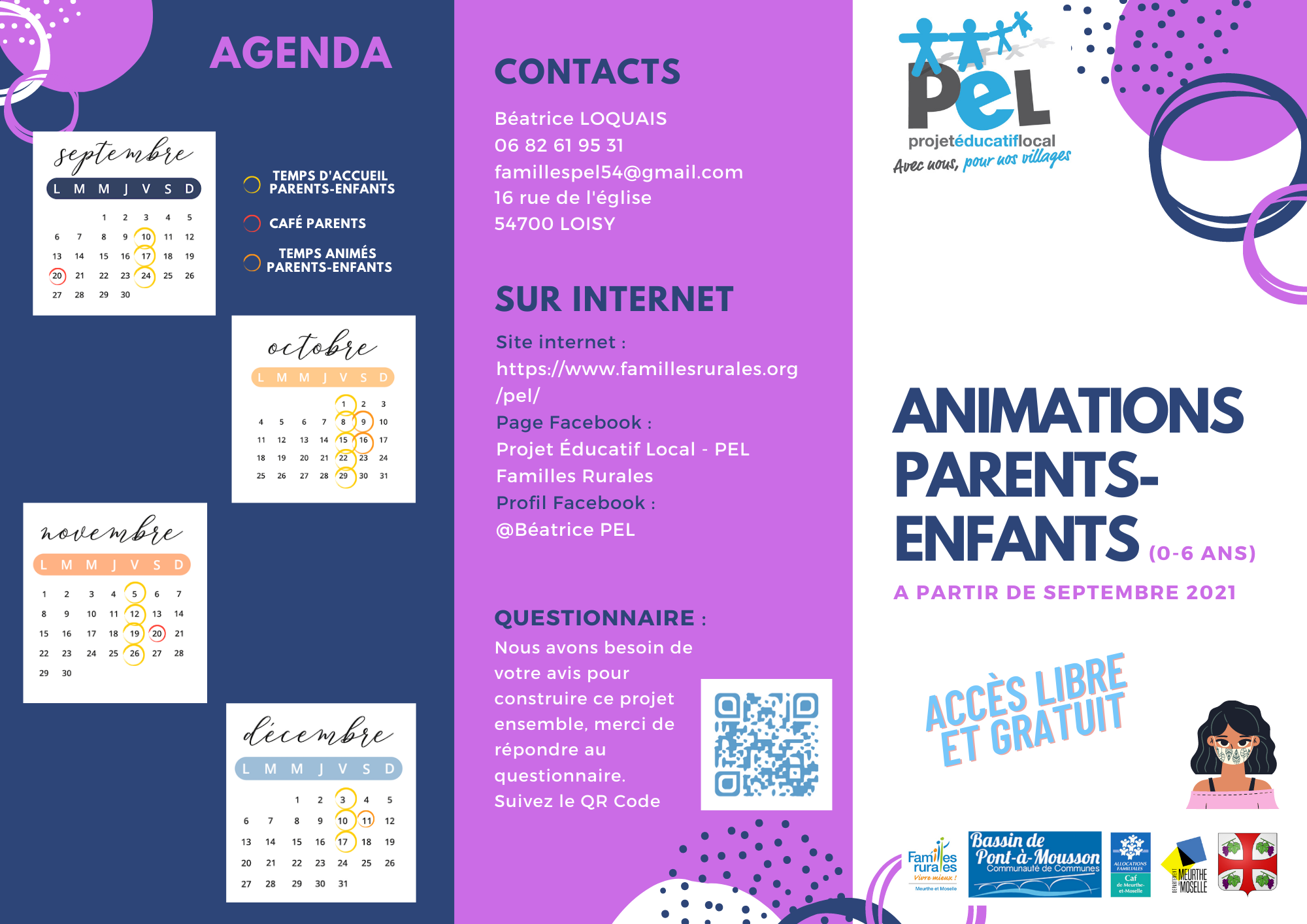 A partir de septembre 2021, le PEL vous proposent des animations parents-enfants sur le territoire. Des rencontres tous les vendredis, des cafés-parents et des temps d'activités animés en alternance une fois par mois.