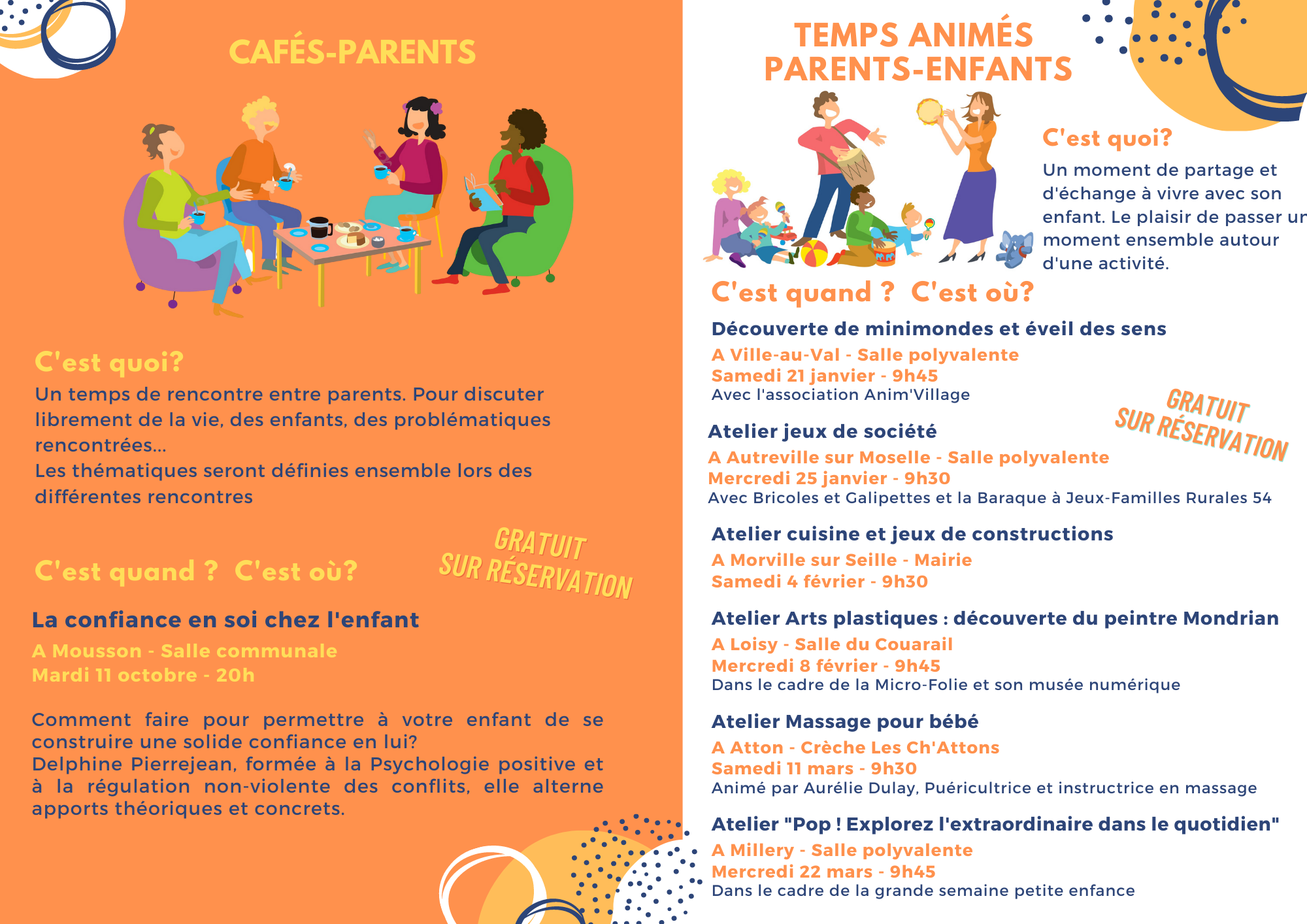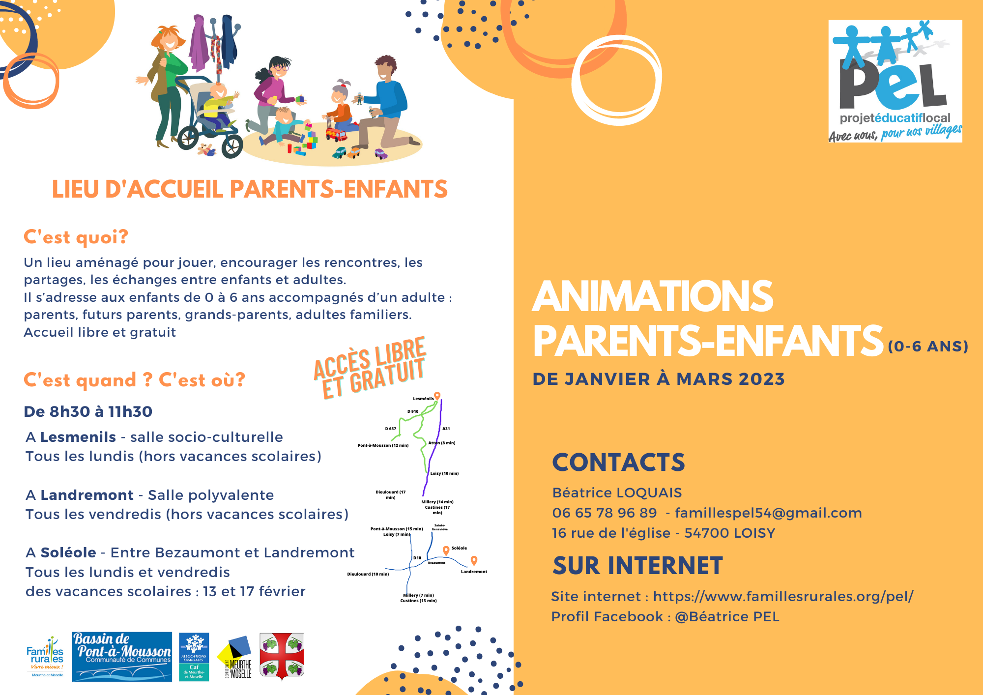Béatrice Loquais, animatrice famille du PEL-Familles Rurales et les associations du territoire vous proposent de nombreuses actions de janvier à mars 2023 : un Lieu d'Accueil Enfants-Parents ouvert deux fois par semaine, un café-parent et des ateliers animés pour les enfants et leurs parents.