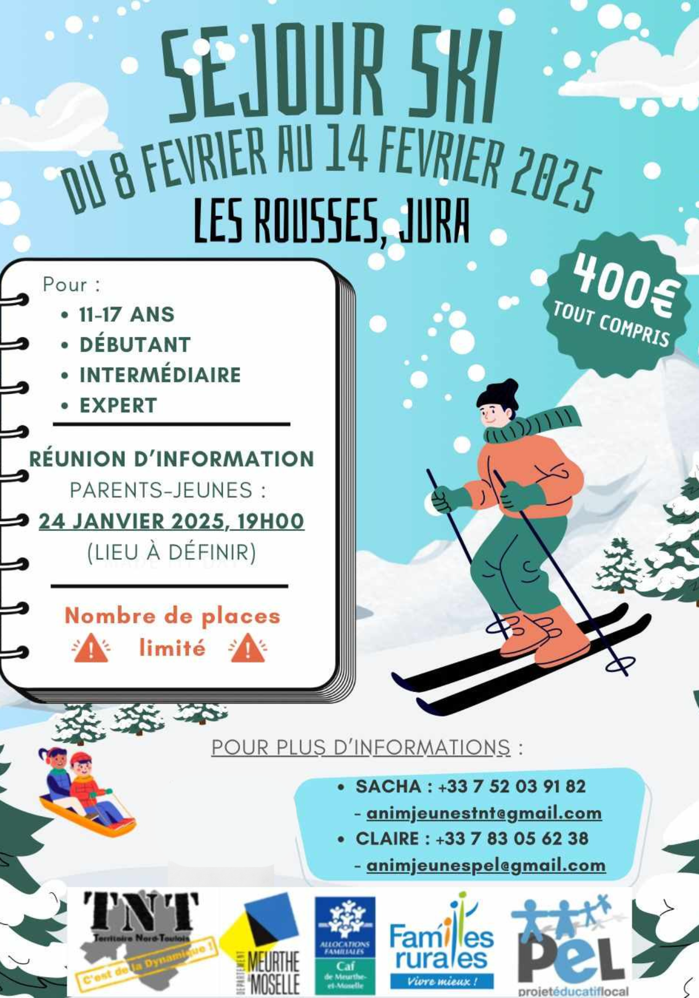 Les associations et élus siégeant au PEL et TNT ont voté une prise en charge de 206 € par enfant afin de favoriser le départ en vacances. Le prix coûtant par enfant serait de 606 € sans cette prise en charge par les associations. Ce tarif inclut les frais de matériel de ski, les forfaits, le transport, l'hébergement, l'équipe d'animation et la restauration.