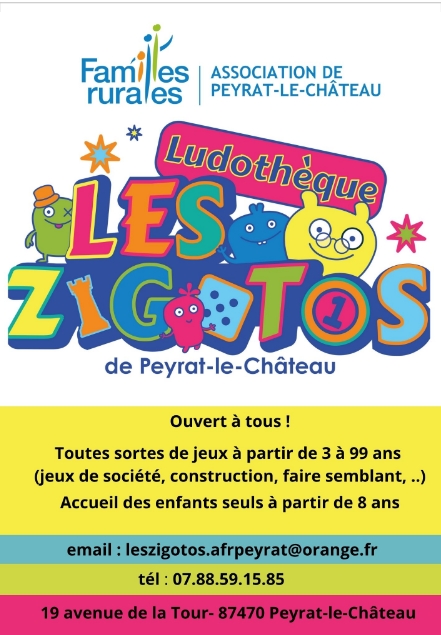 Bienvenue sur la page de la ludothèque Les Zigotos de Peyrat-le-Château, située au 19 Avenue de la Tour à Peyrat-le-Château.