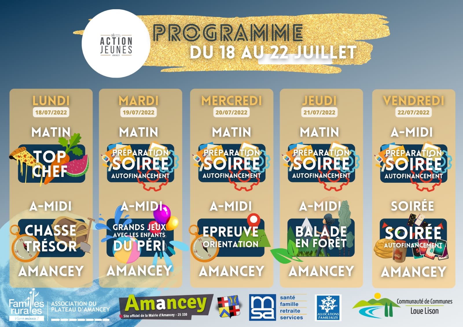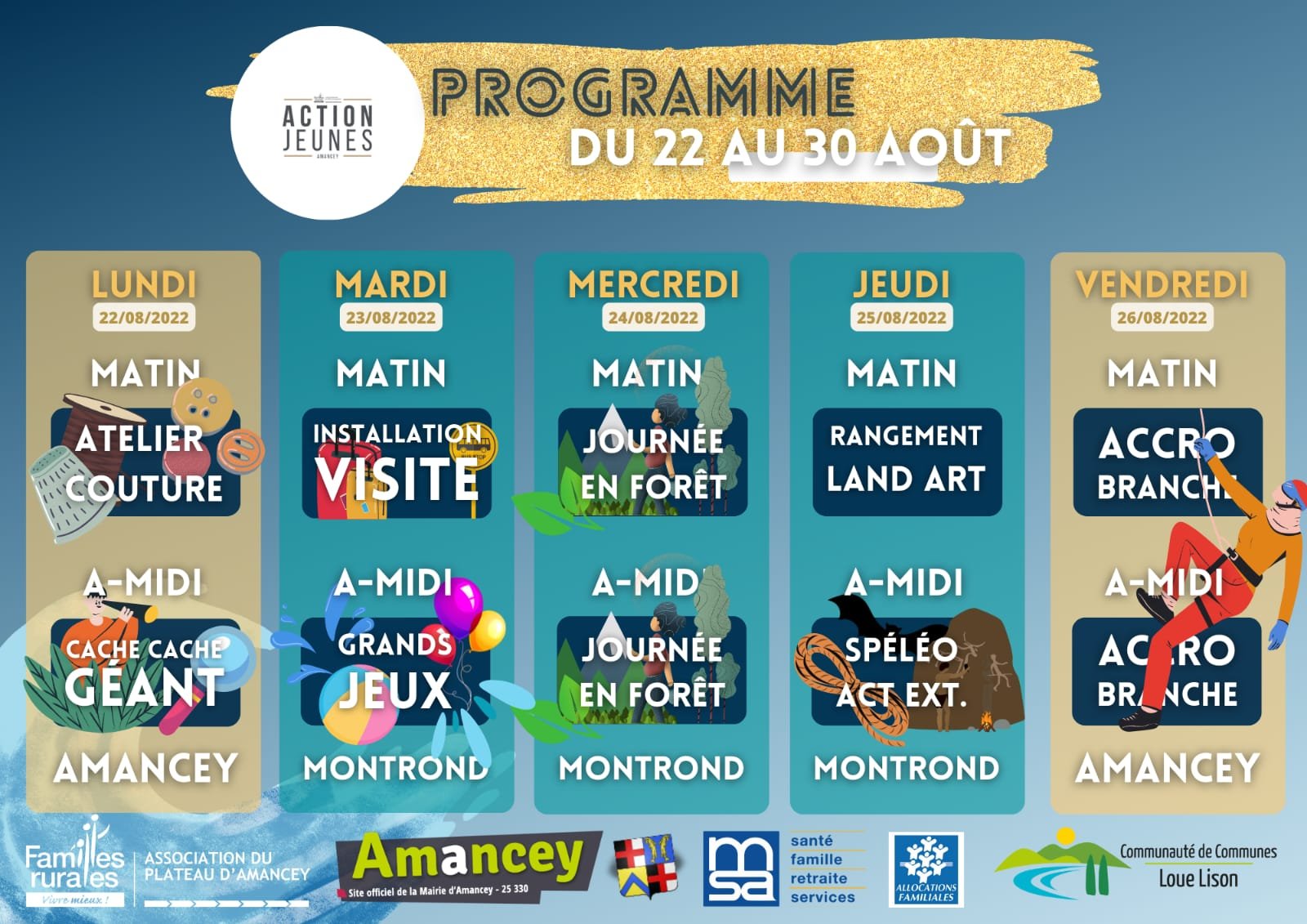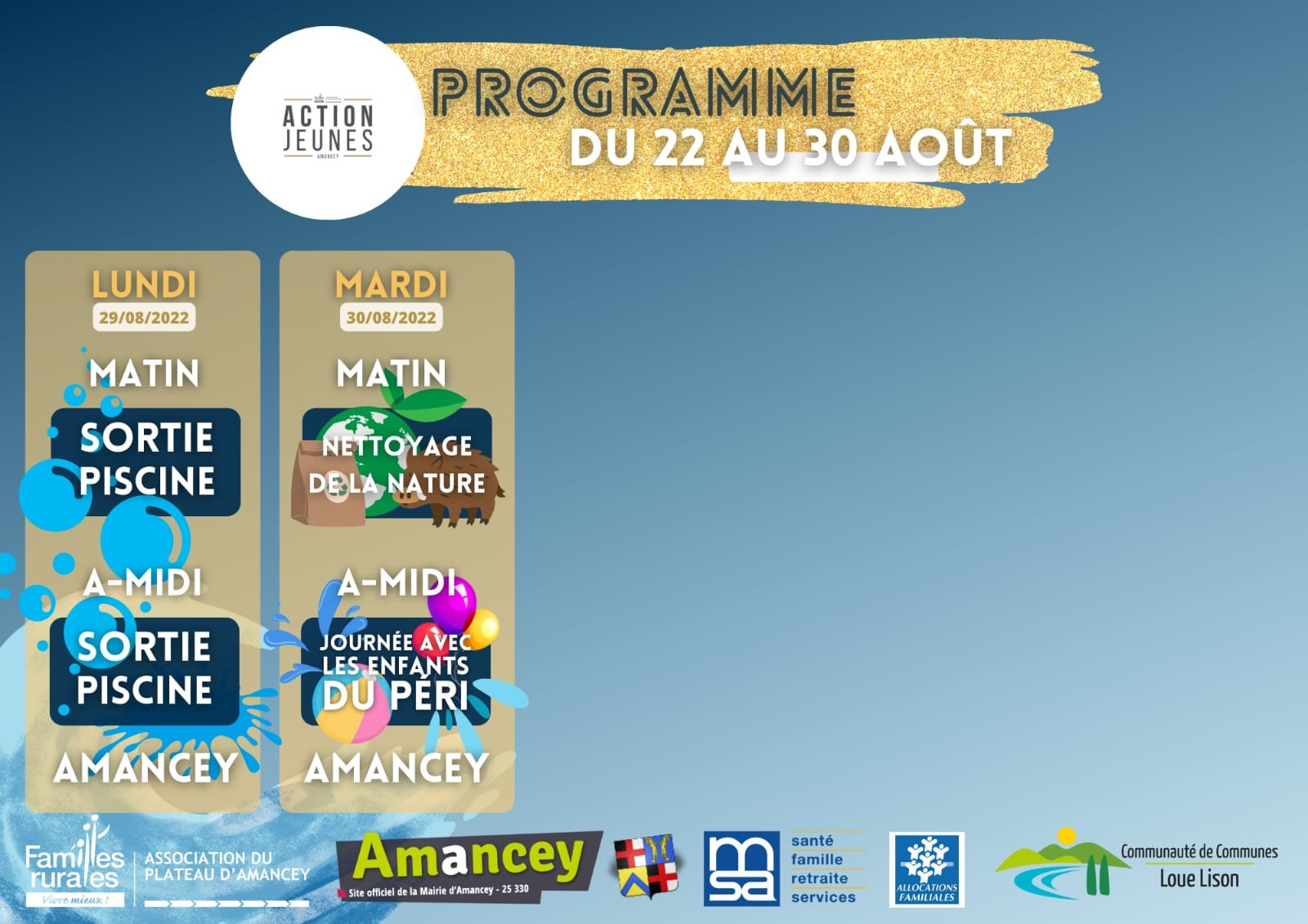 - Accueil de Loisirs du 22 au 30 Août dont un mini séjour du 23 au 25 Août inscriptions sur le Portail Familles.