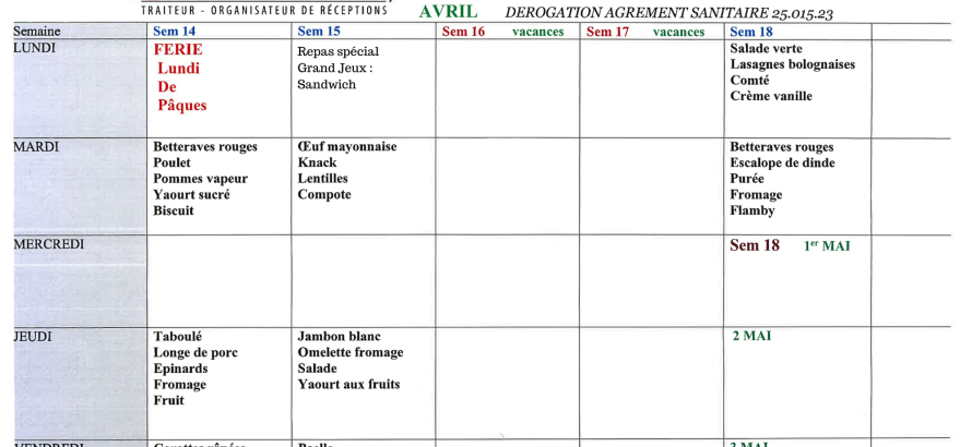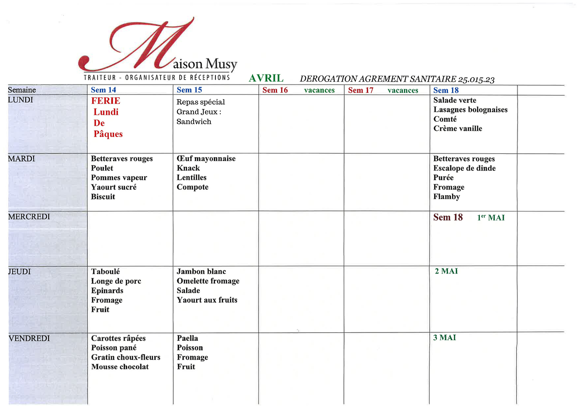 28 mars 2024 Les menus du mois d'avril sont disponibles ! Merci à notre prestataire Maison Musy Traiteur pour son travail. Vous pourrez consulter son site à l'adresse suivante: https://www.musytraiteur.com/