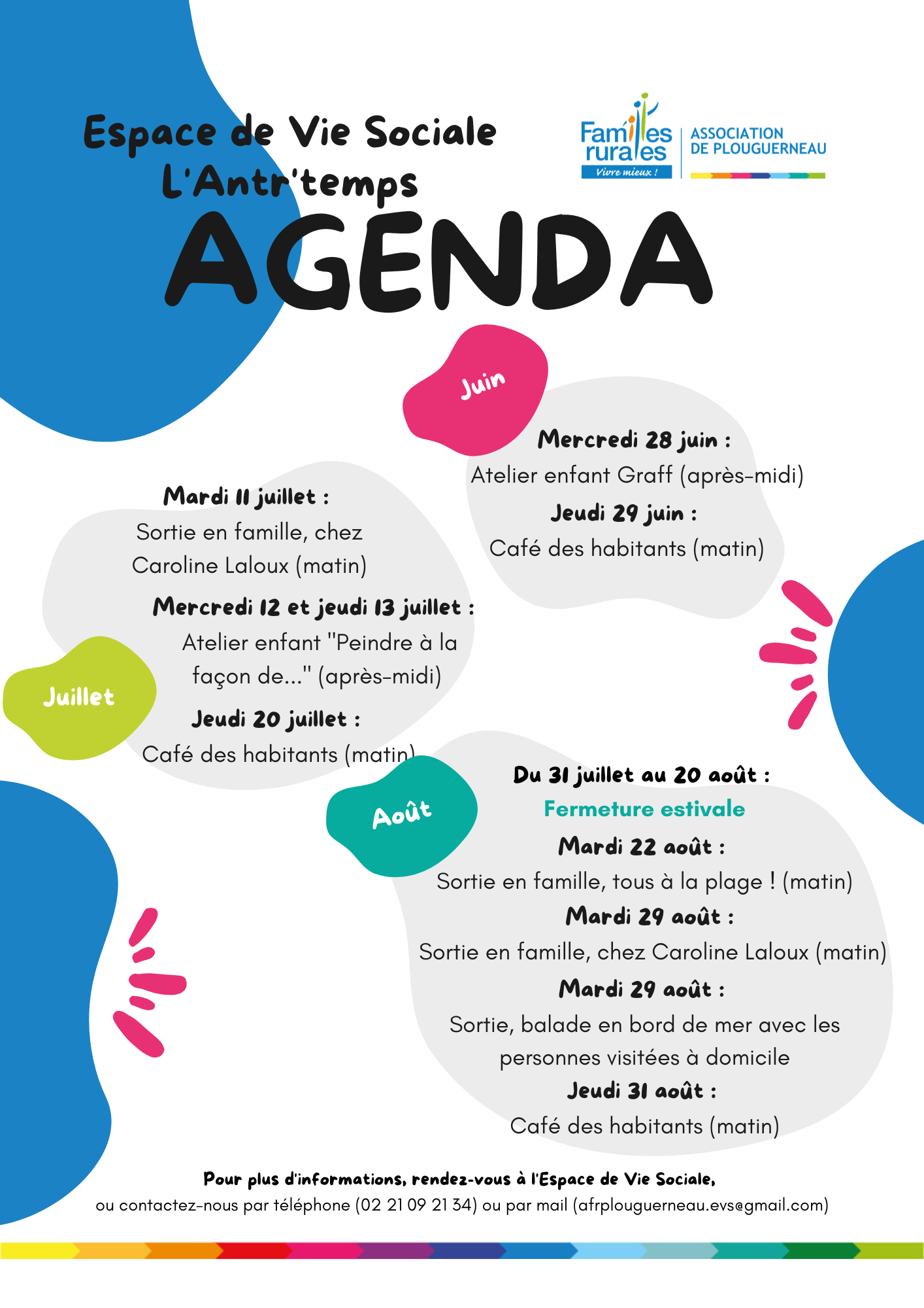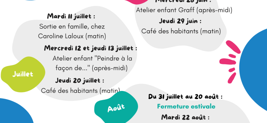 Retrouvez ici le programme des activités portées dans le cadre de l'Espace de Vie Sociale l'Antr'temps pour la période d'été !