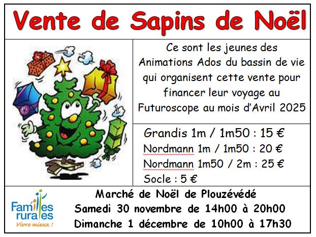 Comme chaque année les jeunes des animations Ados seront présent sur le marché de Noël le samedi 30 novembre et dimanche 1 décembre pour vendre des sapins. Les bénéfices serviront à financer leur voyage au Futuroscope en avril 2025.