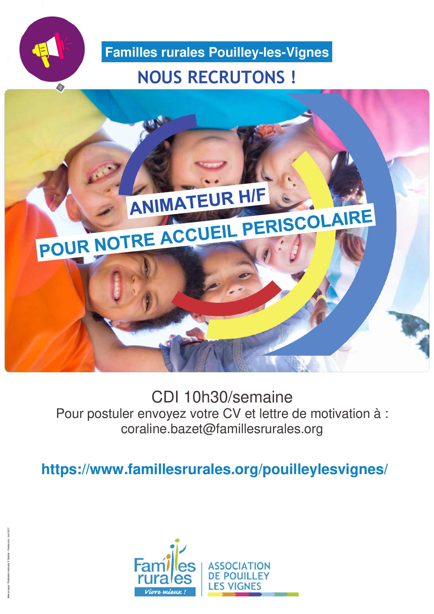 Pour postuler envoyez votre CV et lettre de motivation à : coraline.bazet@famillesrurales.org