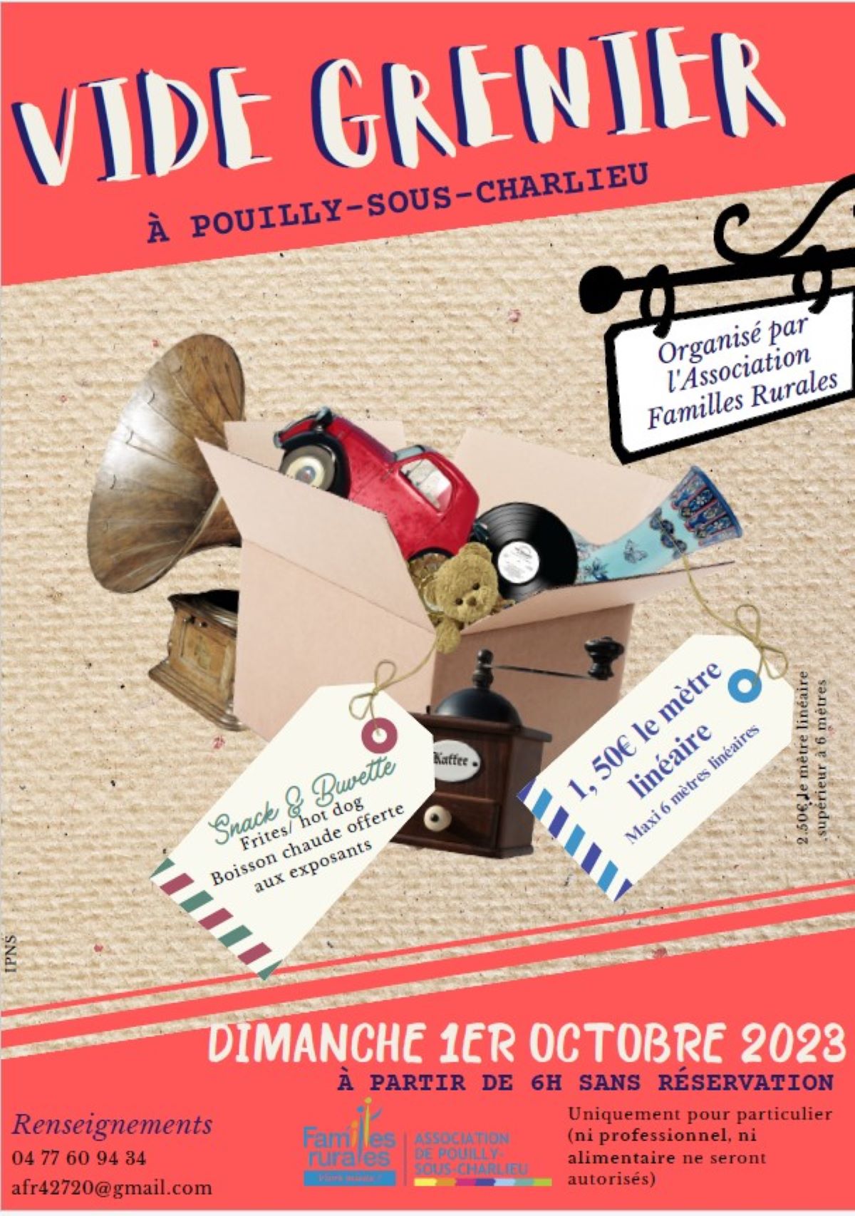 Vide-Greniers à Pouilly sous Charlieu au cœur du village Exposants, Chineurs, on vous attend le 1° octobre à partir de 6h 1 octobre 2023