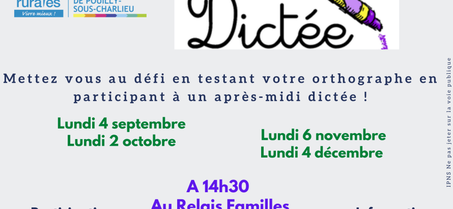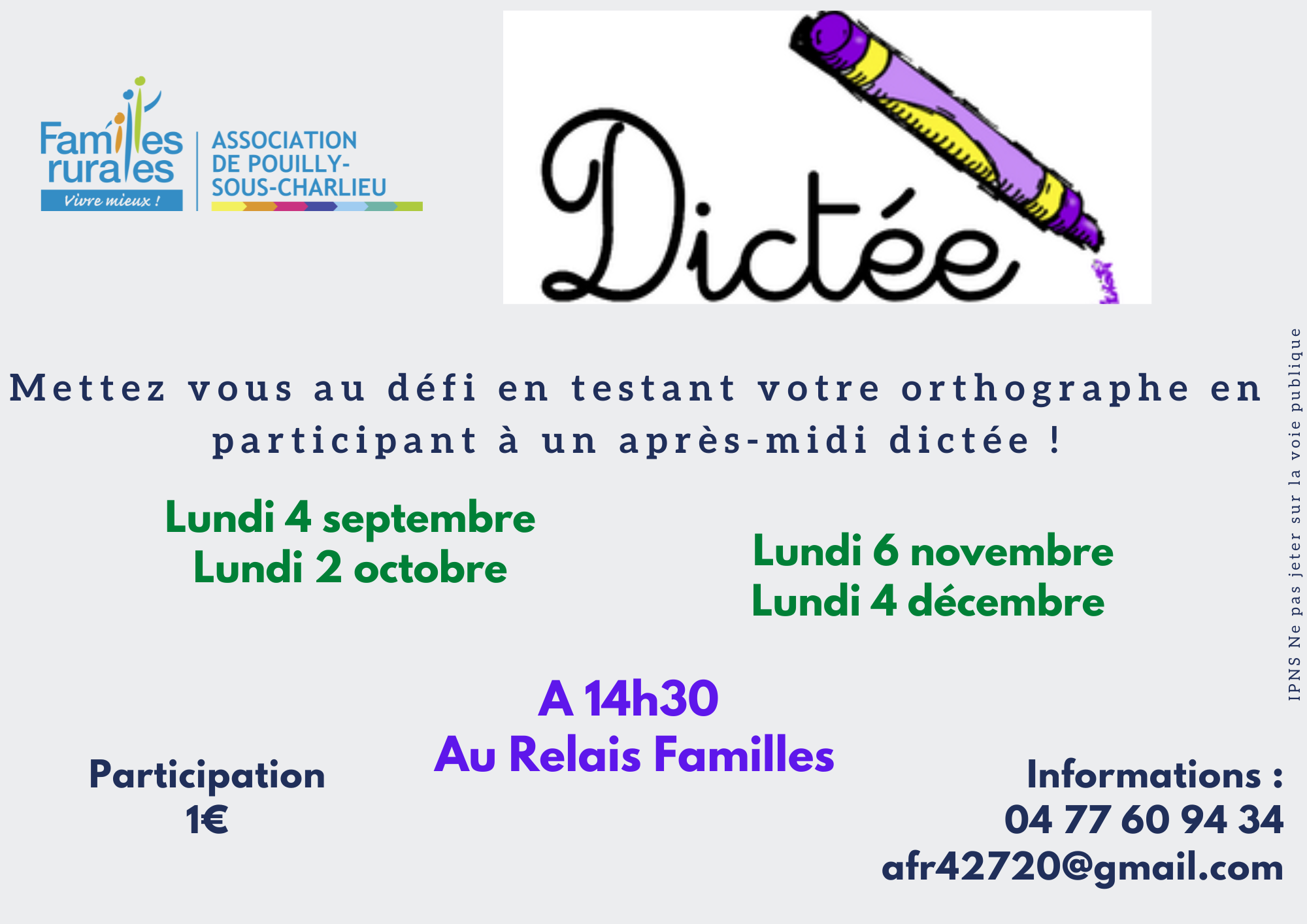 Prochaine dictée le 2 Octobre 2023 au relais de l'AFR 2 octobre 2023 DICTEE POUR TOUS Venez rejoindre le groupe qui tous les 1er lundi de chaque mois vient s' amuser et retrouver leur âme d'écolier avec la dictée et partager un goûter . Cet atelier est proposé tous les 1er lundi de chaque mois.