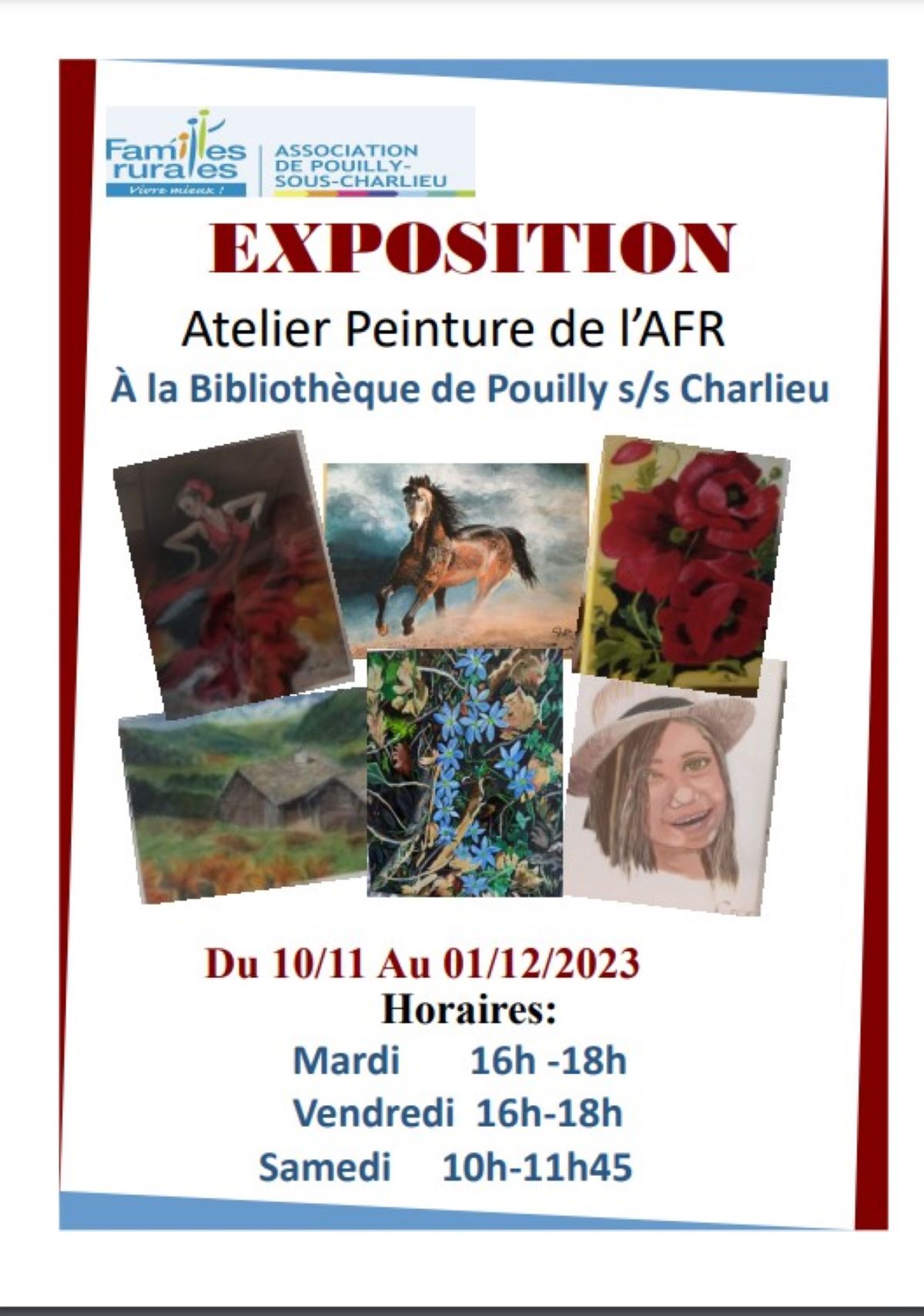 Venez admirer les artistes de l'AFR du 10 novembre au 1 décembre 2023 à la bibliothèque de Pouilly sous Charlieu