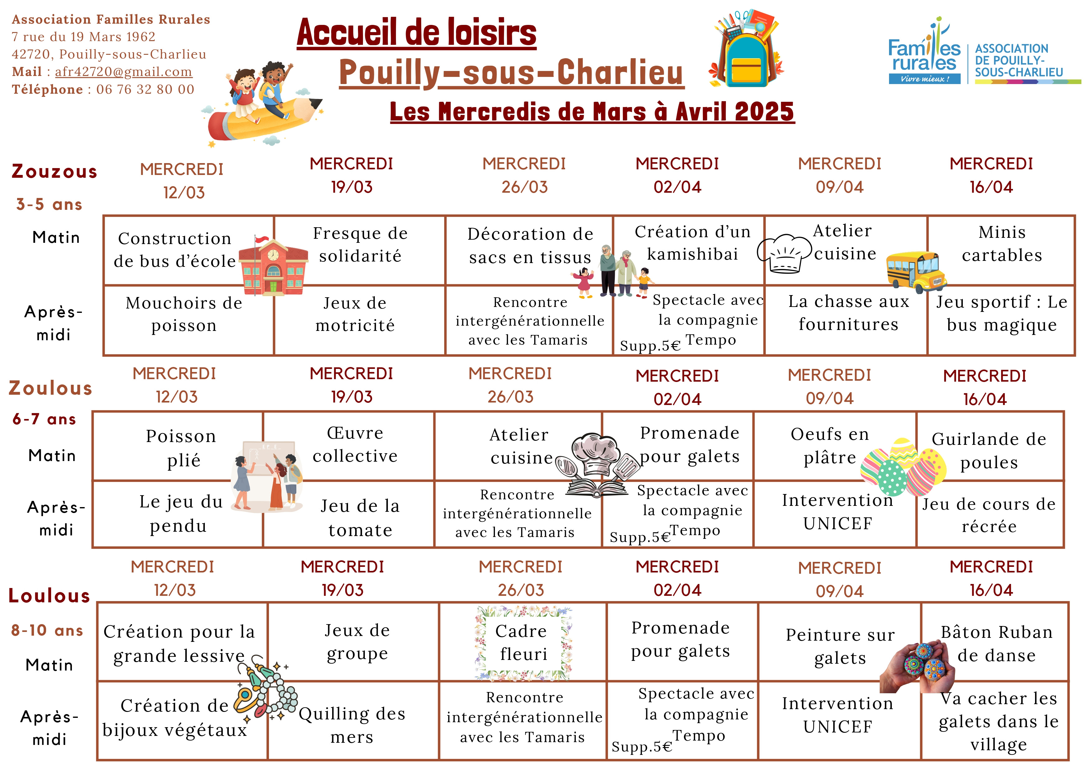 Mercredis de Janvier-février 2025 Mercredis de Septembre - Octobre 2025 Mercredis de Mars-Avril 2025 Mercredis Novembre - Décembre 2025 mercredis de Mai à Juillet 2025 Contact pour les Inscriptions04 77 60 94 34 - 06 76 32 80 00afr42720@gmail.com En savoir plus mercredi mars avril.pdf1.26 Mo