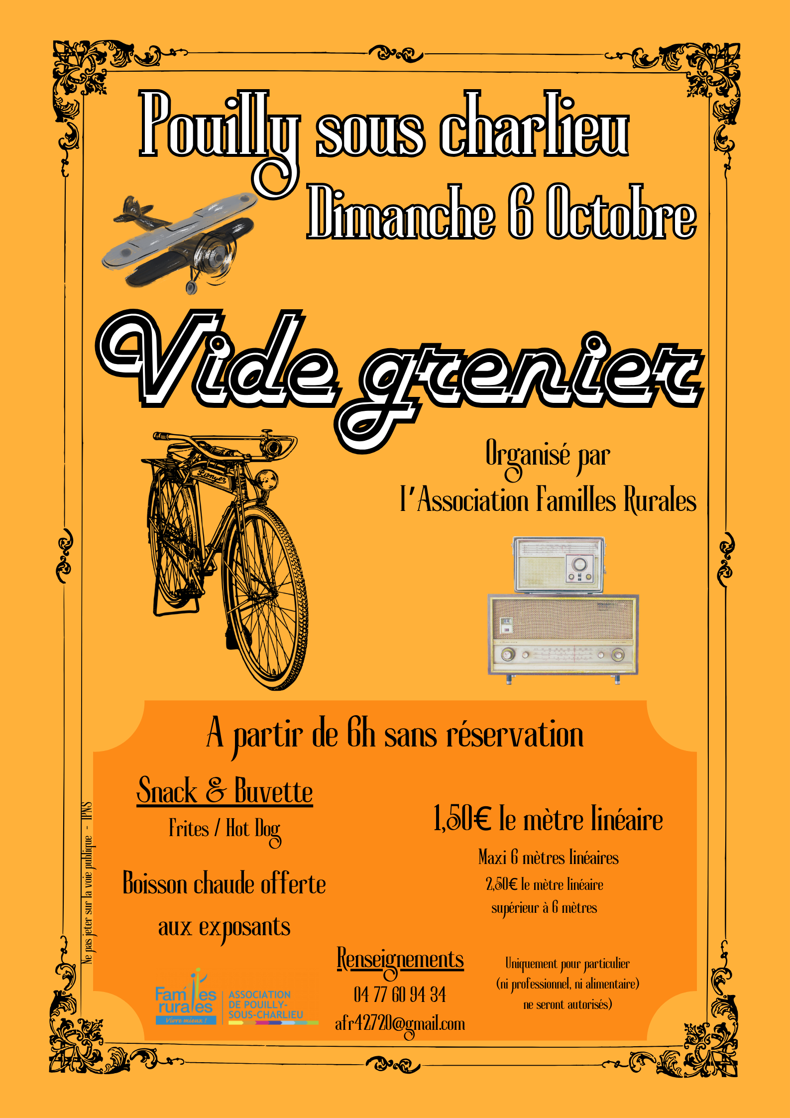 L'Association Familles Rurales de Pouilly-sous-Charlieu organise un vide grenier le dimanche 6 Octobre 2024. On vous attend nombreux et nombreuse à partir de 6h ! ☺️