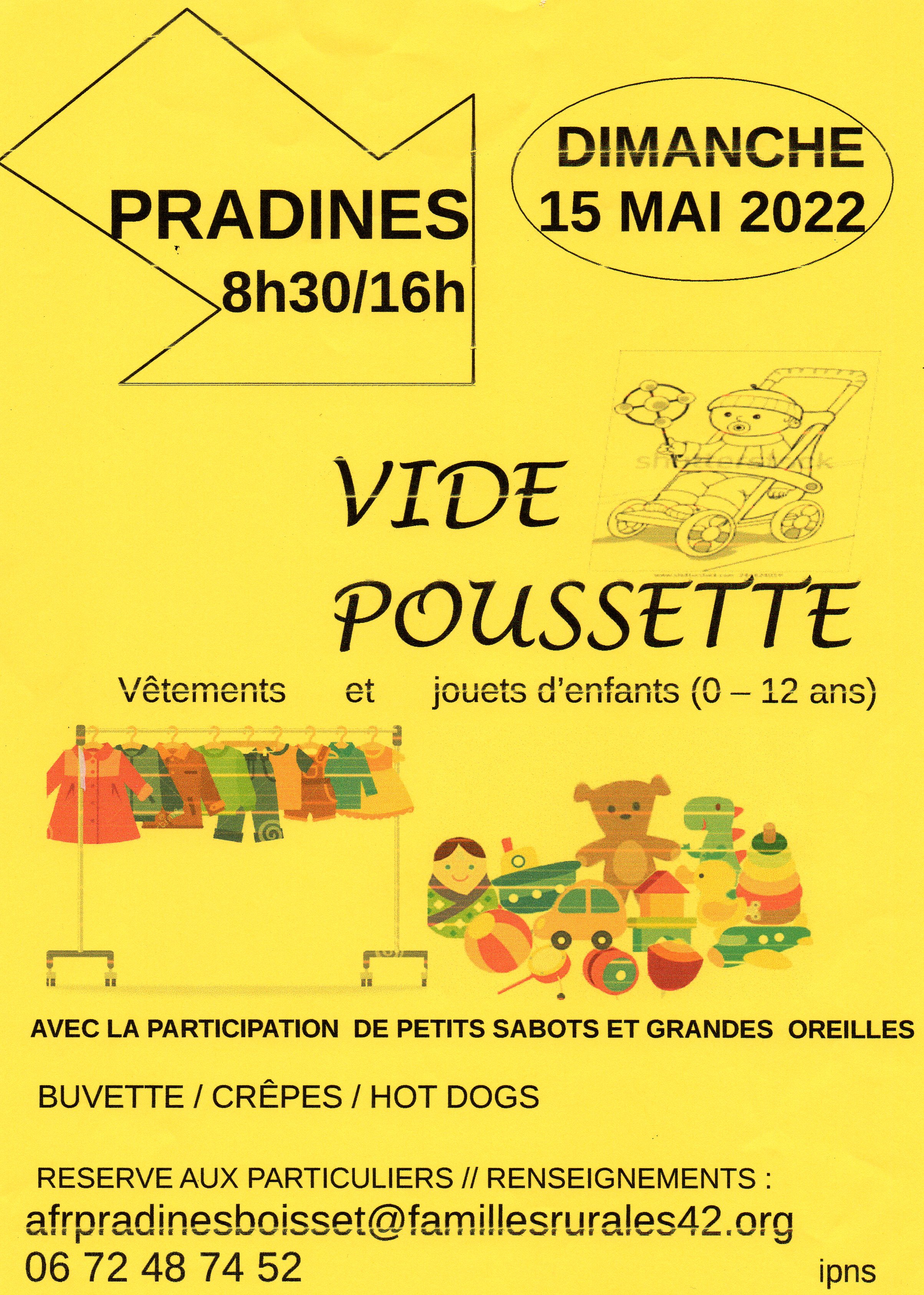 Le Dimanche 15 mai 2022: Vide poucette: Vente par des particuliers de vêtements ou de jeux pour enfants de 0 à 12 ans. A Pradines 42630, salle des fêtes et extérieurs. Hot Dogs, crêpes et boissons vendus sur places. Avec la participation de petits sabots et grandes oreilles (tour à dos d'âne pour les enfants). 2 euros le mètre linéaire. De 8h30 à 16h (public). renseignement au 06 72 48 74 52
