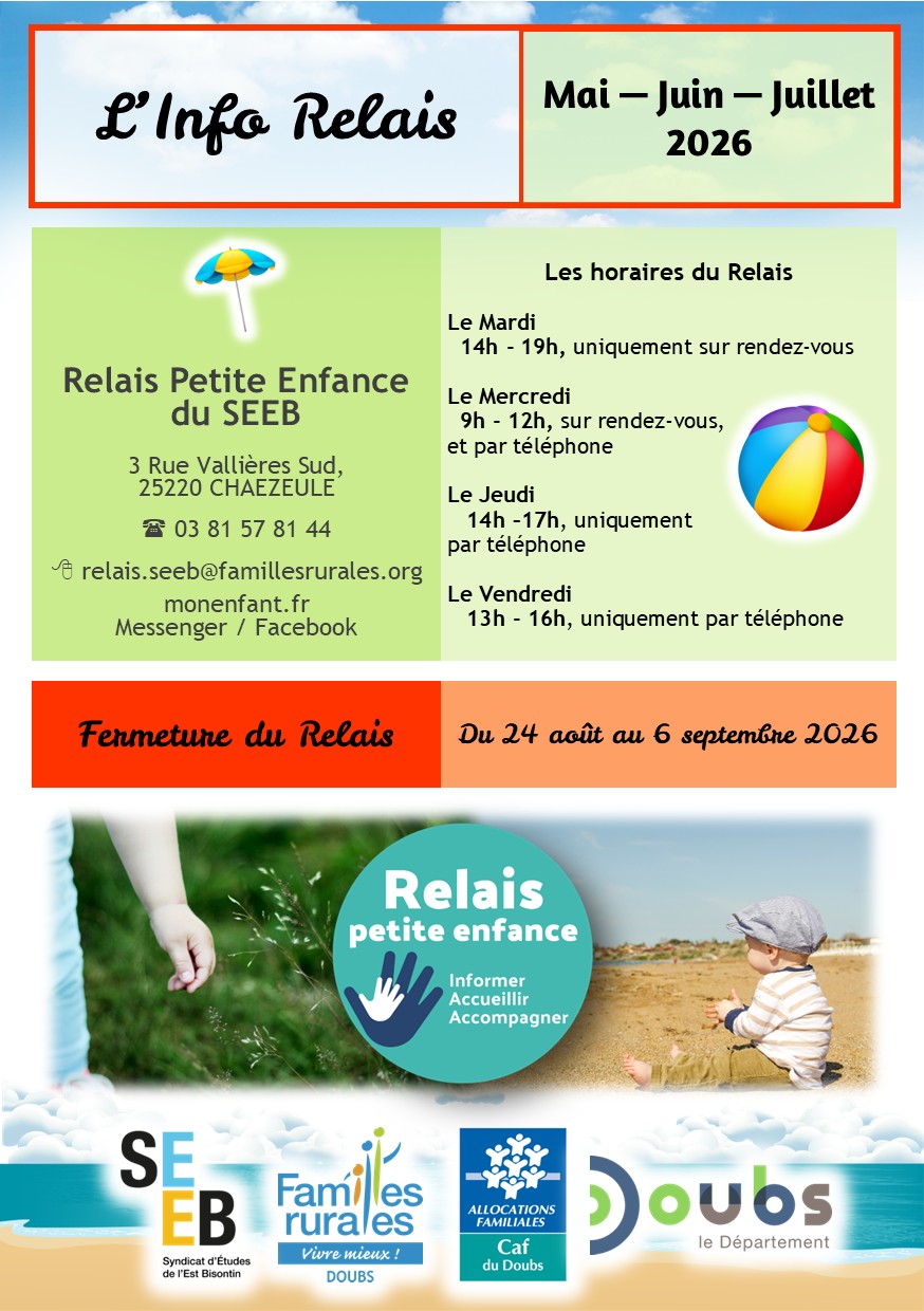 Présentation Actualités Les Actions du Relais Les photos Le Journal Contact Vous pouvez retrouver le journal INFO-RELAIS en format PDF en cliquant sur l'image ou ci-dessous ! En savoir plus Journal Relais SEEB - Mai-Juin-Juillet - 2026 (version numérique) - compressé.pdf836.58 Ko Journal Relais SEEB - Mars - Avril - 2026 (version numérique).pdf942.62 Ko Journal Relais SEEB - Janvier-Février 2026 (version numérique) - compressé.pdf1.11 Mo Journal Relais SEEB Novembre - Décembre 2025 (version numérique) compressé.pdf1.25 Mo