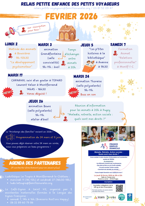 Avant toute première participation, il vous sera demandé de prendre connaissance de la "Charte des animations" et de nous la retourner signer à l'adresse mail du relais : relais.petits-voyageurs@famillesrurales.org.