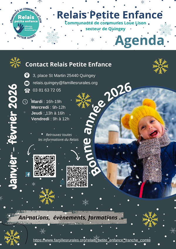 Présentation Actualités Agenda Actions du Relais Les photos Spectacle Contact Vous pouvez télécharger l'agenda du Relais Petite Enfance en cliquant sur l'image ci-dessous En savoir plus Agenda Janvier février 20262.82 Mo