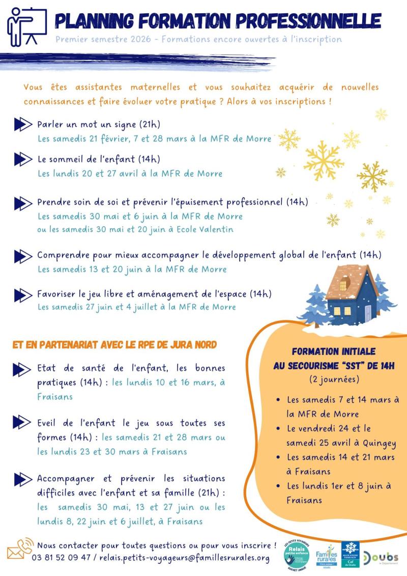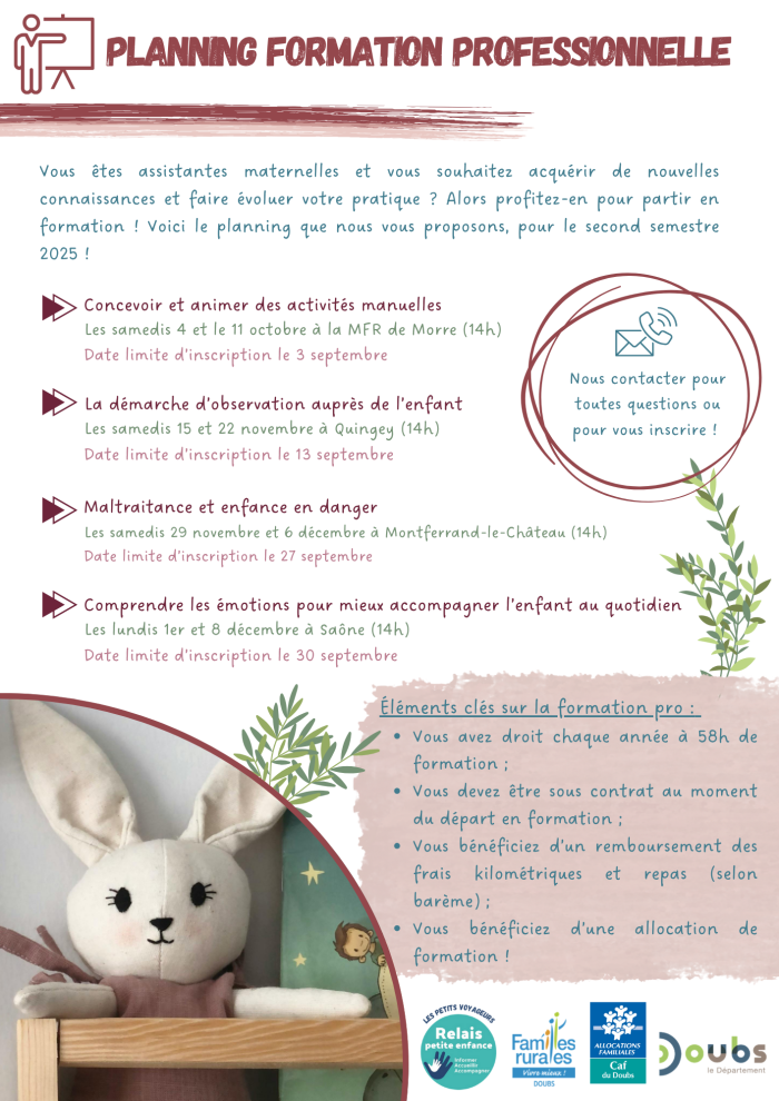 Le Relais Petite Enfance des Petits Voyageurs accompagne les assistants maternels et gardes à domicile du territoire, dans leurs pratiques professionnelles en proposant des formations référencées par la branche professionnelle, des temps d'analyse de la pratique ou encore des ateliers thématiques.