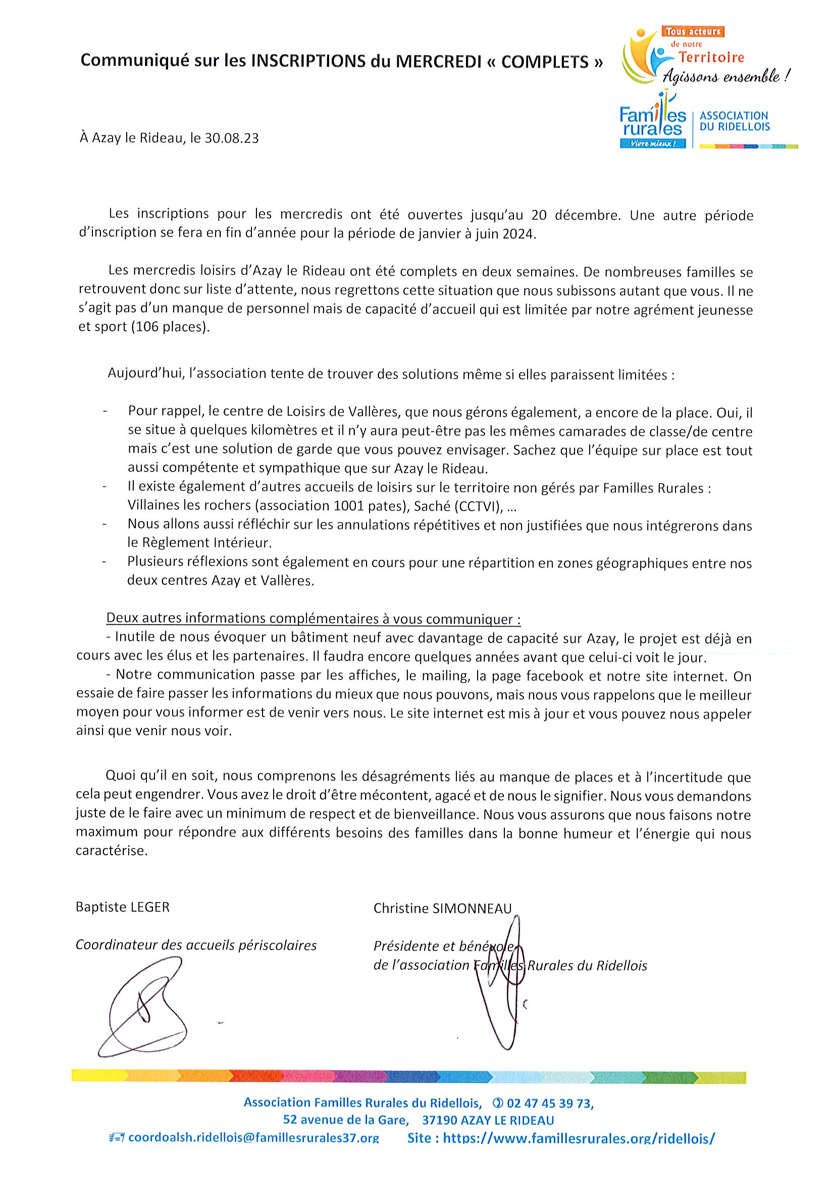 Communiqué - IMPORTANT - Mercredis Azay Complets