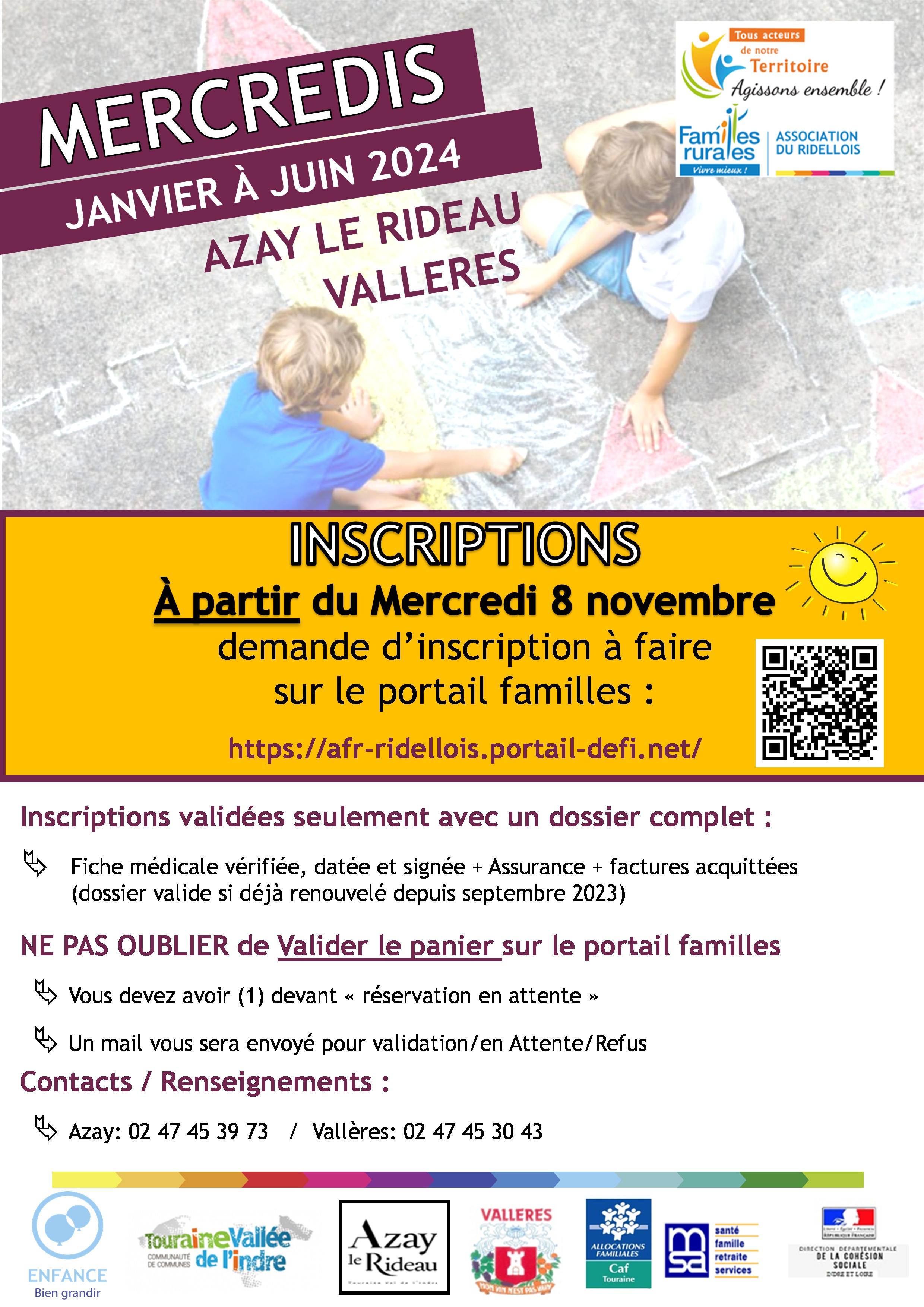 Les inscriptions pour les mercredis à Azay et Vallères entre janvier et juin 2024 commenceront le mercredi 8 novembre sur le portail familles.