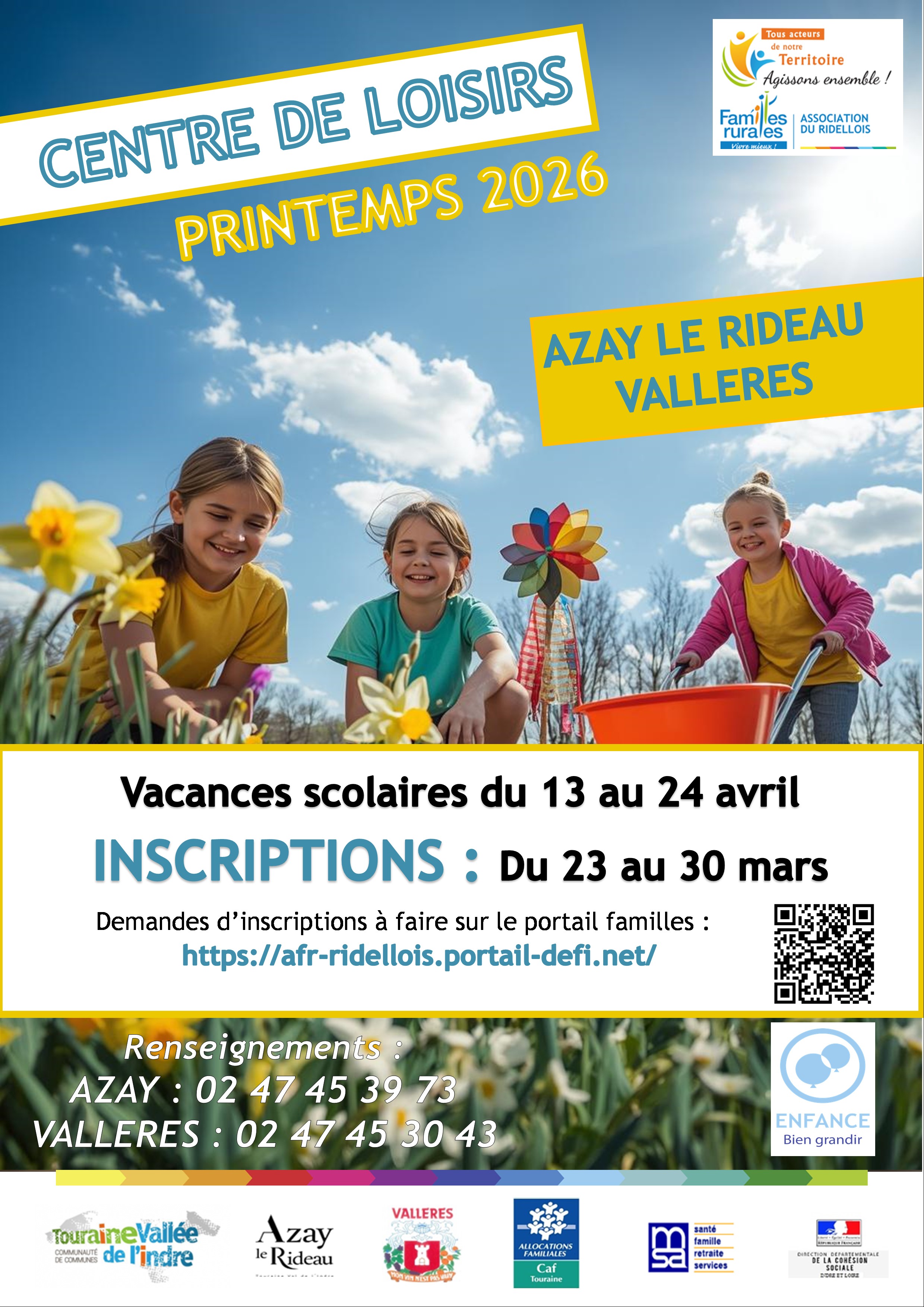 Les centres de loisirs d'Azay le Rideau et de Vallères seront ouverts :
