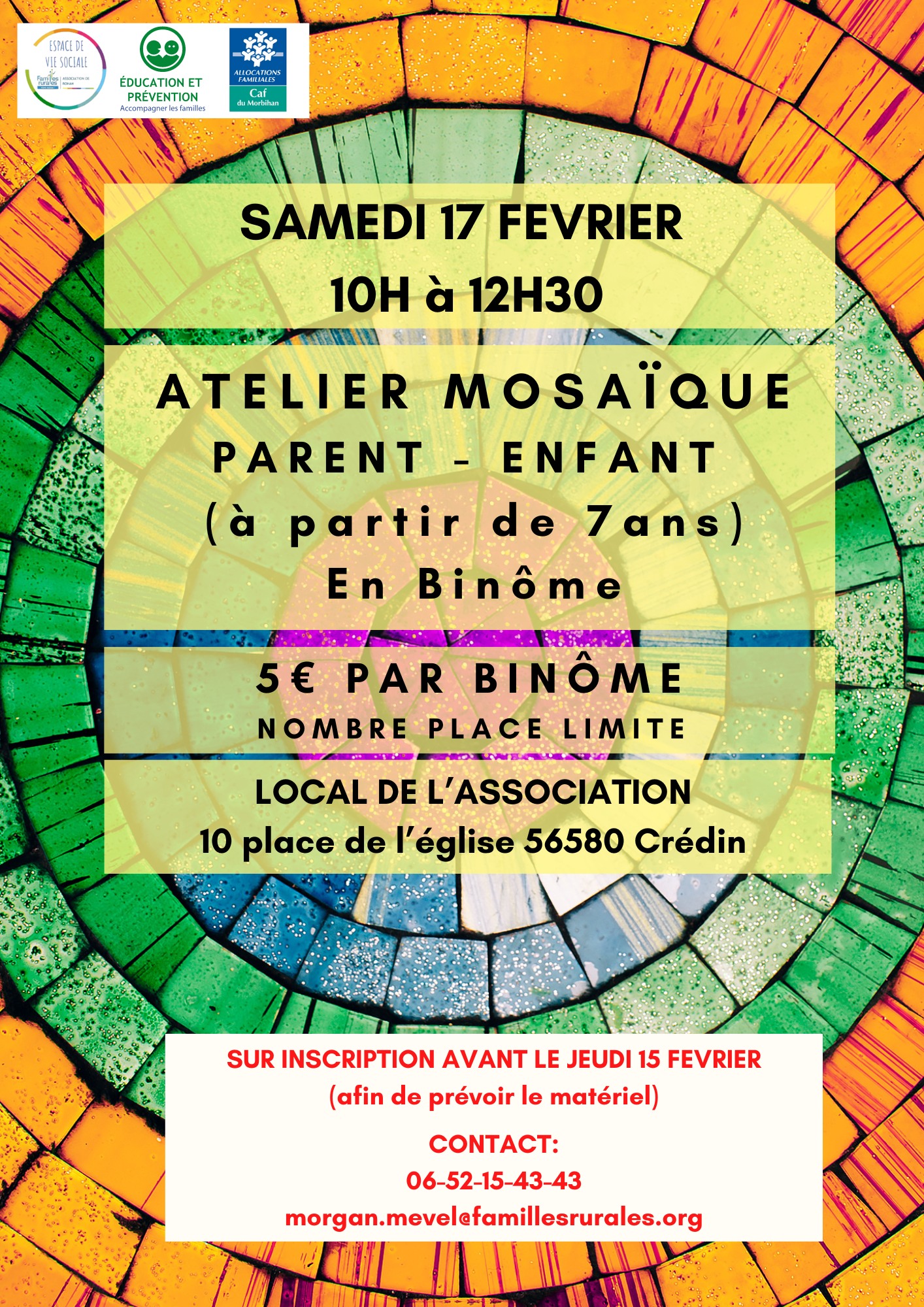 La samedi 17 février, de 10h à 12h30, dans le cadre des actions autour de la parentalité, Familles rurales Rohan organise un atelier en binôme parent/enfant pour la réalisation d'une mosaïque.