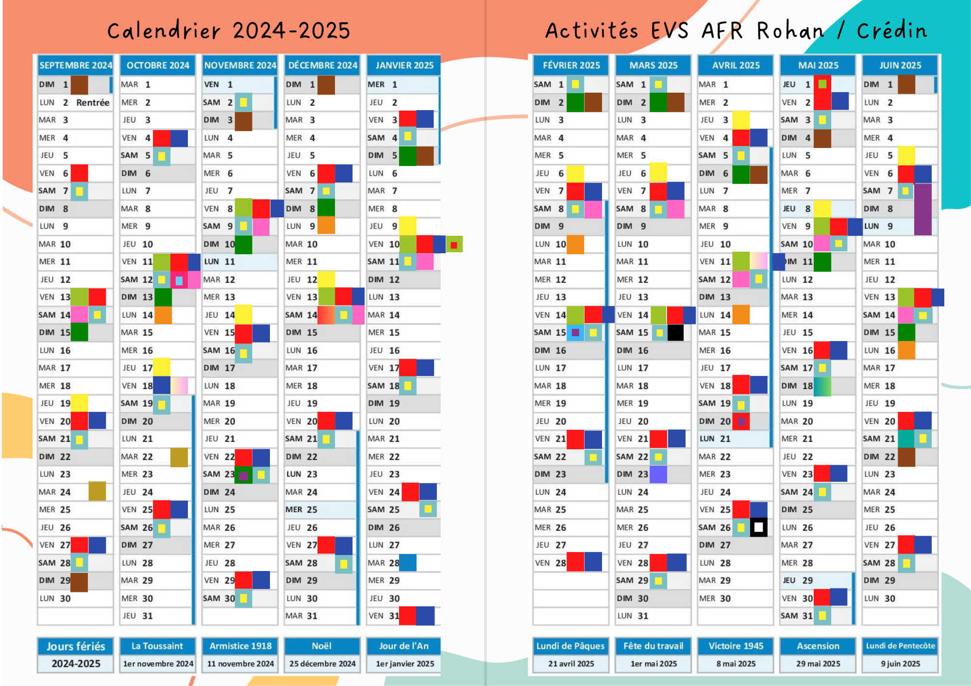 Le calendrier de l'Espace de Vie Sociale regroupe les différents événements et activités prévus jusqu'en août 2025.