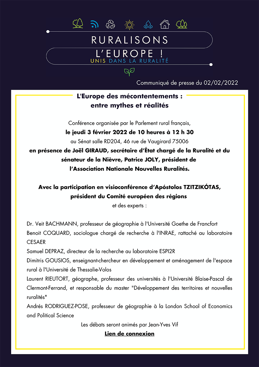 Le Parlement rural français - dont Familles Rurales est membre fondateur - s’engage pour la promotion d’un Agenda rural européen dans le cadre de la présidence française de l’Union Européenne. La webconférence du 3 février est accessible à tous via le lien Zoom.