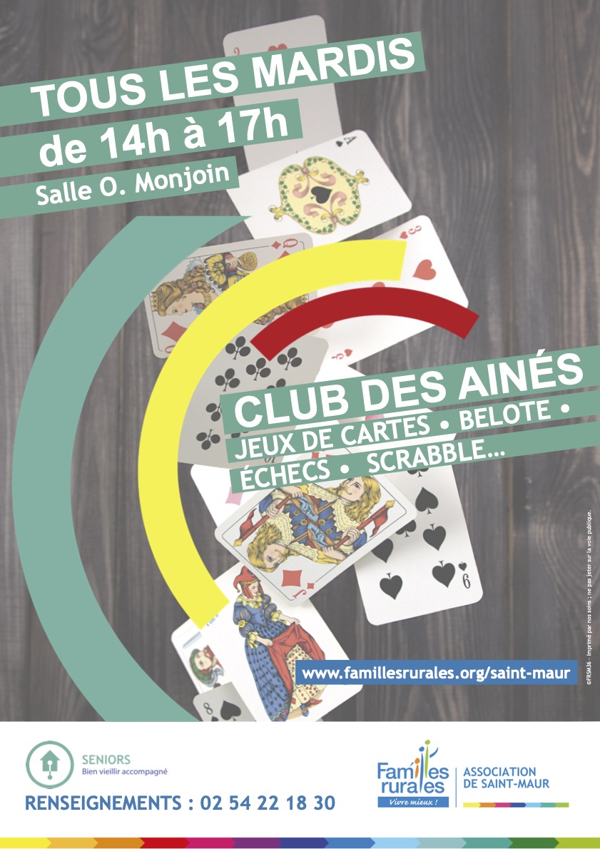 Les membres du Club des Aînés vous donnent rendez-vous tous les mardis après midi de 14H à 18h (attention : le lieu peut varier). Pour plus de renseignements, n'hésitez pas à appeler le 02.54.22.18.30 et laissez nous un message ; nous vous recontacterons.