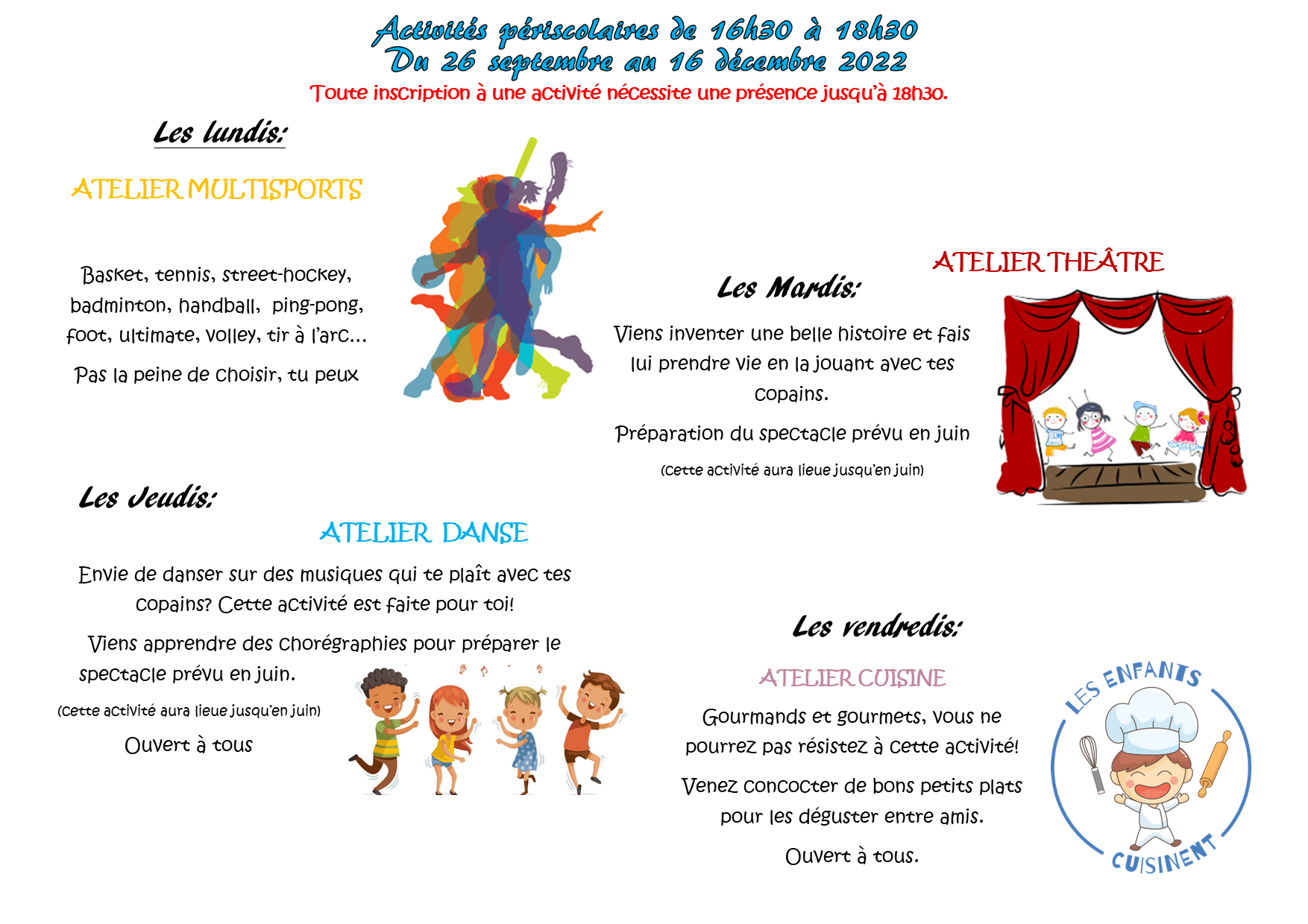 Pensez à remplir un dossier d'inscription pour toute nouvelle inscription. Les dossiers sont disponibles en téléchargement dans l'onglet "infos pratiques", rubrique "dossiers d'inscription".
