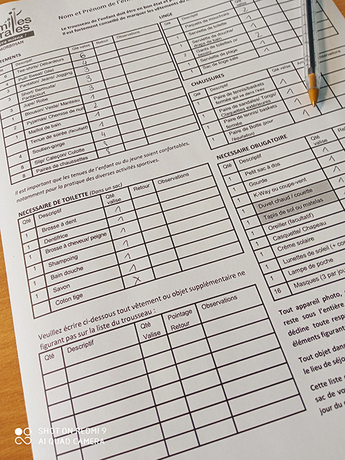 Un trousseau avec les affaires à apporter sera envoyé aux parents avant le début du séjour. Celui-ci sera également téléchargeable sur notre site internet (voir en bas de la page). Ce dernier reprend l'ensemble des vêtements, linge, chaussures, nécessaire de toilettes et autres que nous conseillons de prévoir, avec un espace à remplir afin que nous puissions aider à faire l'inventaire des affaires le dernier jour !