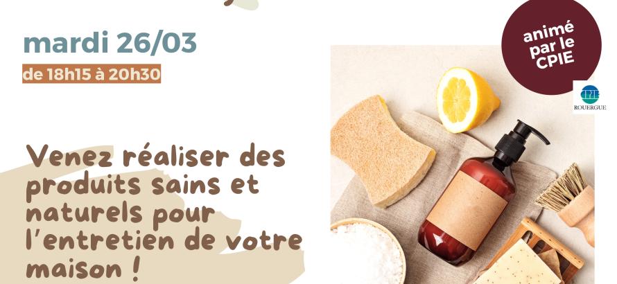 Sur la thématique environnementale, l’Espace Ô9 de Familles Rurales s’associe avec le CPIE du Rouergue pour vous proposer un temps mardi 26 mars de 18h15 à 20h30 autour de la fabrication de produits ménagers. Vous repartirez avec les recettes, votre fabrication et plein de TIPS entre participants…