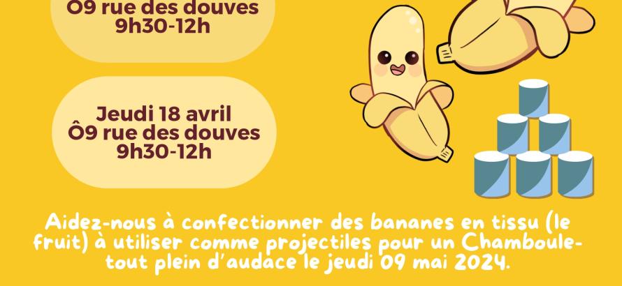 Dans le cadre du marché de printemps organisé par la Mairie de Sévérac d'Aveyron le jeudi 09 mai 2024, Doun EL FamOso proposera des animations intergénérationnelles sur le thème "fête de la banane", il nous a sollicité pour qu'on l'aide à confectionner des bananes (le fruit) en tissu qui serviront de projectiles pour un chamboule-tout