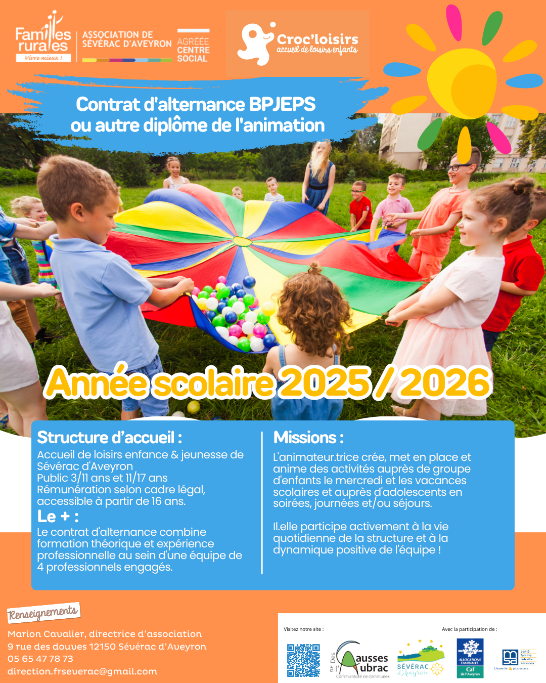 L'Accueil de Loisirs Enfance et Jeunesse de Sévérac d'Aveyron propose d'accompagner un Contrat d'Alternance, BPJEPS ou autre métier de l'animation,
