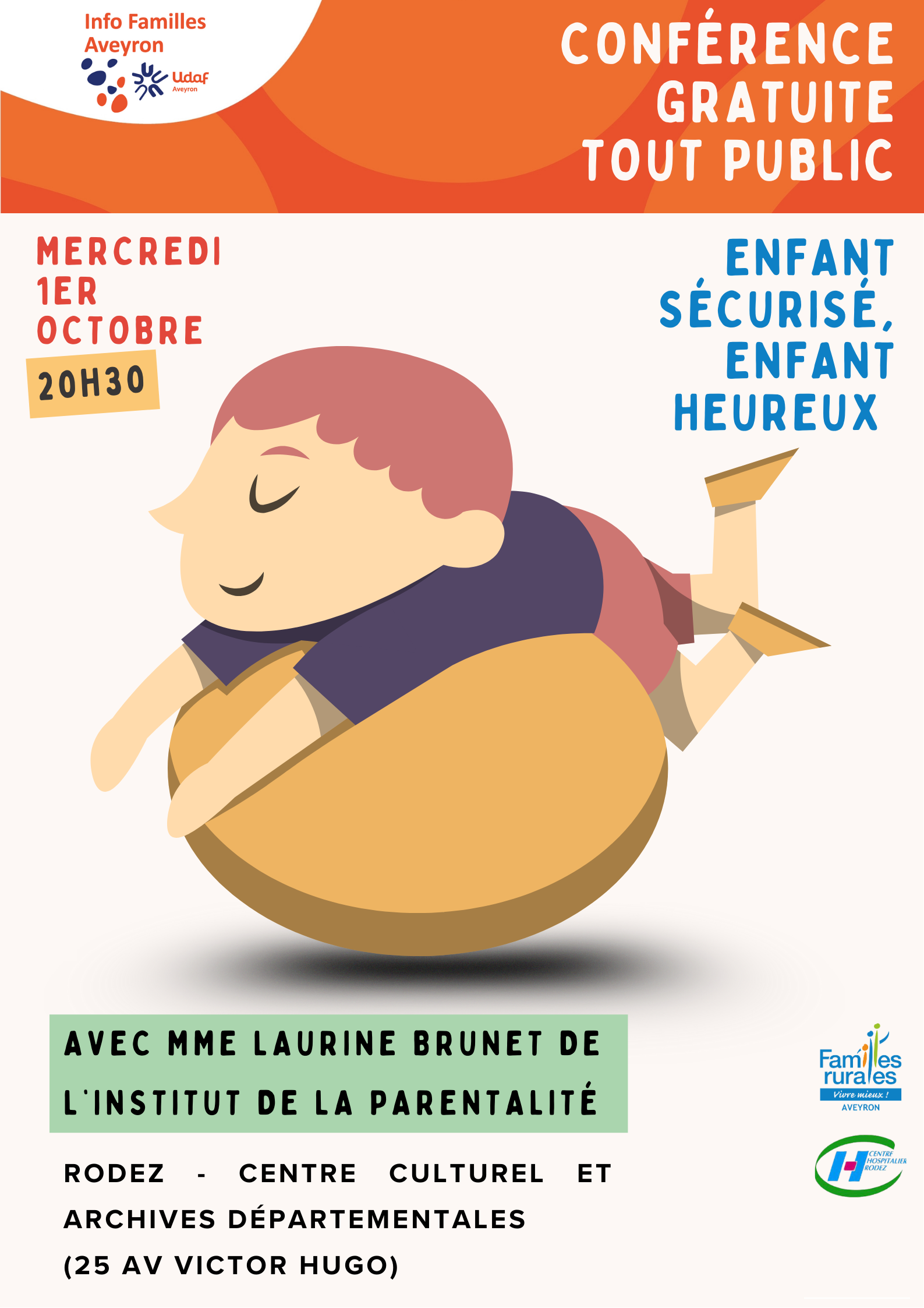 Le mercredi 1er octobre prochain, en partenariat avec la Fédération Familles Rurales et l’Hôpital de Rodez, l’Udaf propose une conférence «Enfant sécurisé, enfant heureux» dans le cadre d’une réflexion sur le « lien d’attachement ». Ce temps d’information sera animé par Laurine Brunet, référente petite enfance à l’Institut de la Parentalité et formatrice spécialisée en attachement.
