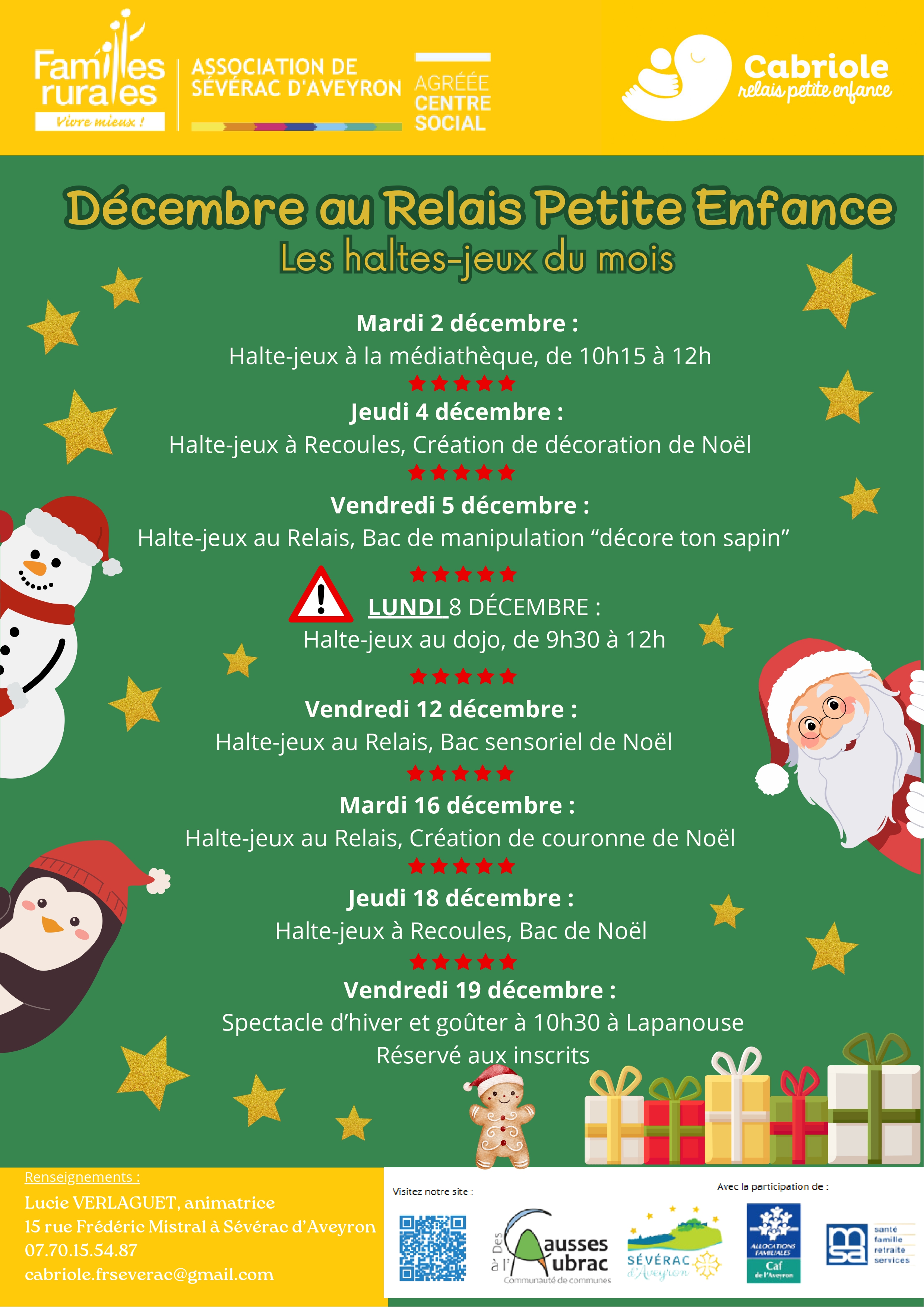 - La halte-jeux au dojo aura lieu le lundi 8 décembre et non le mardi.