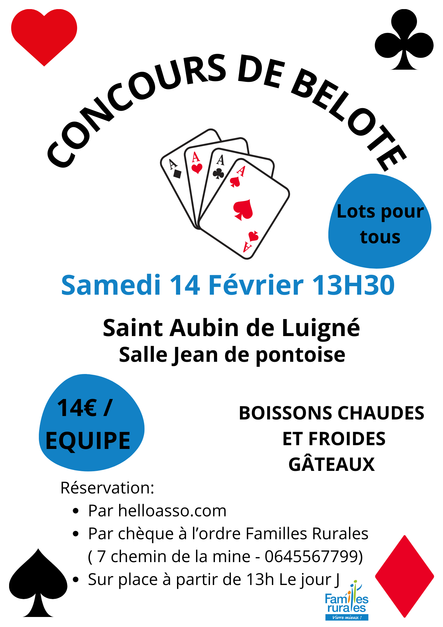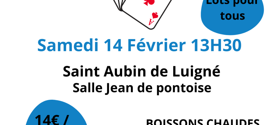 Cette année, l'association organise son premier concours de belote à la salle Jean de pontoise à st aubin de Luigné le samedi 14/02/26 à 13h30. Les pré-inscriptions sont déjà ouvertes ! Des lots pour tous les participants.
