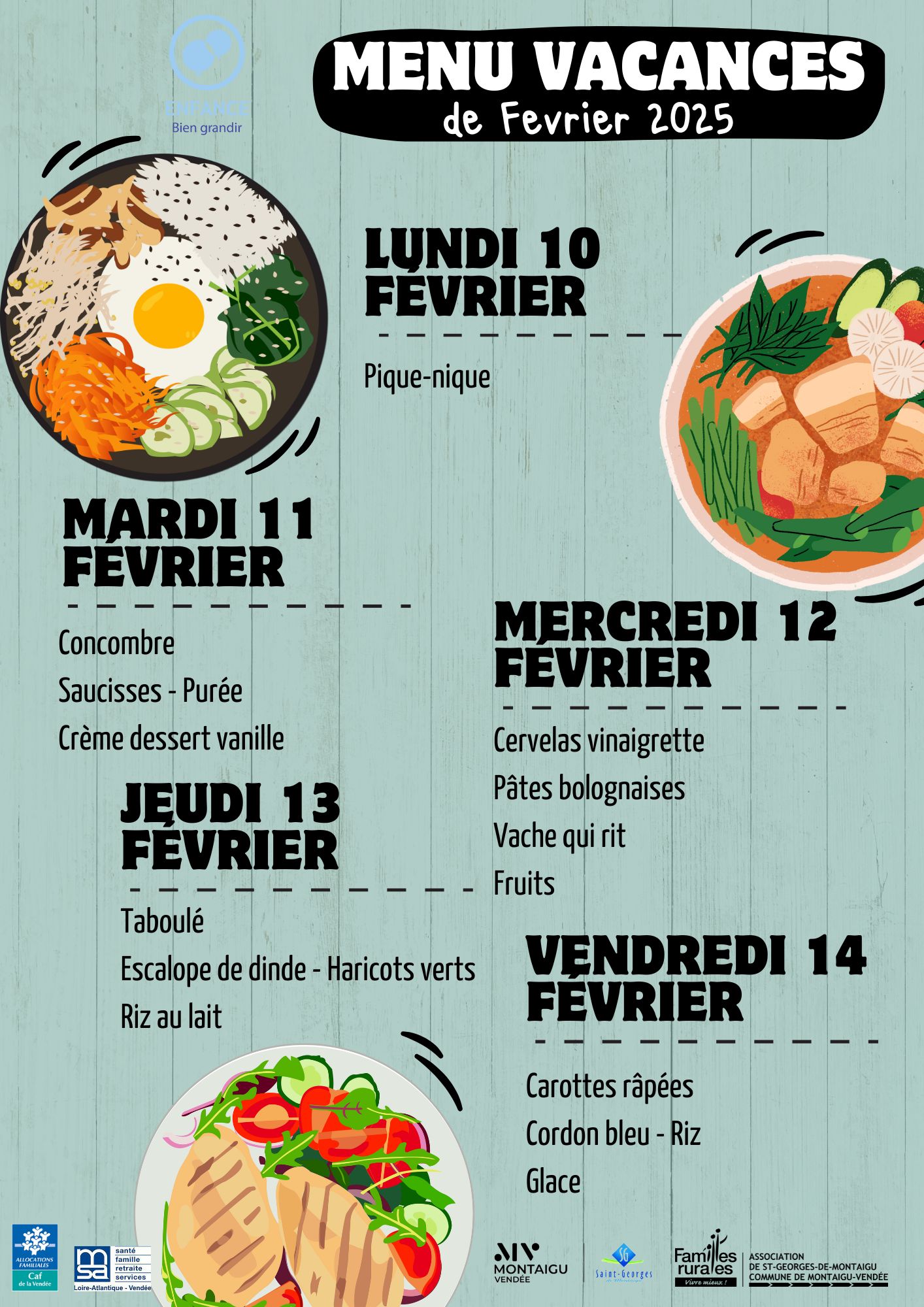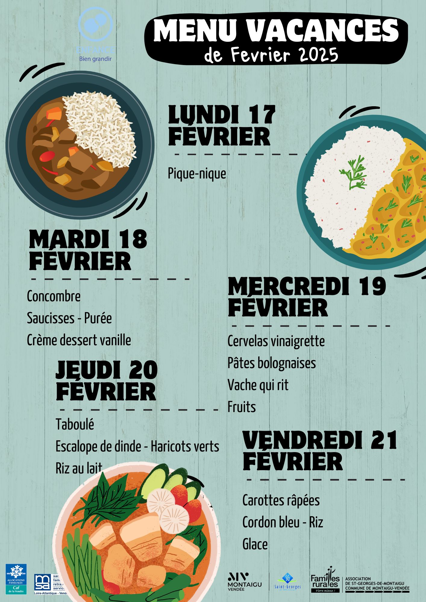 La préparation des menus et des repas est assurée par la Boucherie Durivum et en cas de besoin par un autre prestataire de St Georges de Montaigu. (Toute demande spécifique concernant les repas doit se faire par l’intermédiaire du centre de loisirs.)