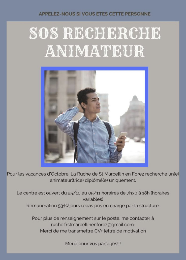 Nous sommes à la recherche d'un animateur diplômé pour les vacances d'Octobre qui se dérouleront du 25 Octobre au 5 Novembre.