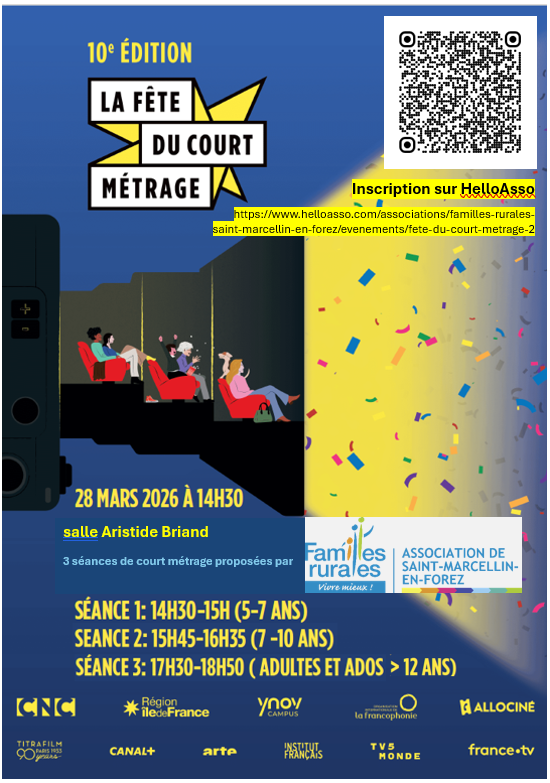 Places limitées. Réservation sur le site Hello Asso : https://www.helloasso.com/associations/familles-rurales-saint-marcellin-en-forez/evenements/fete-du-court-metrage-2