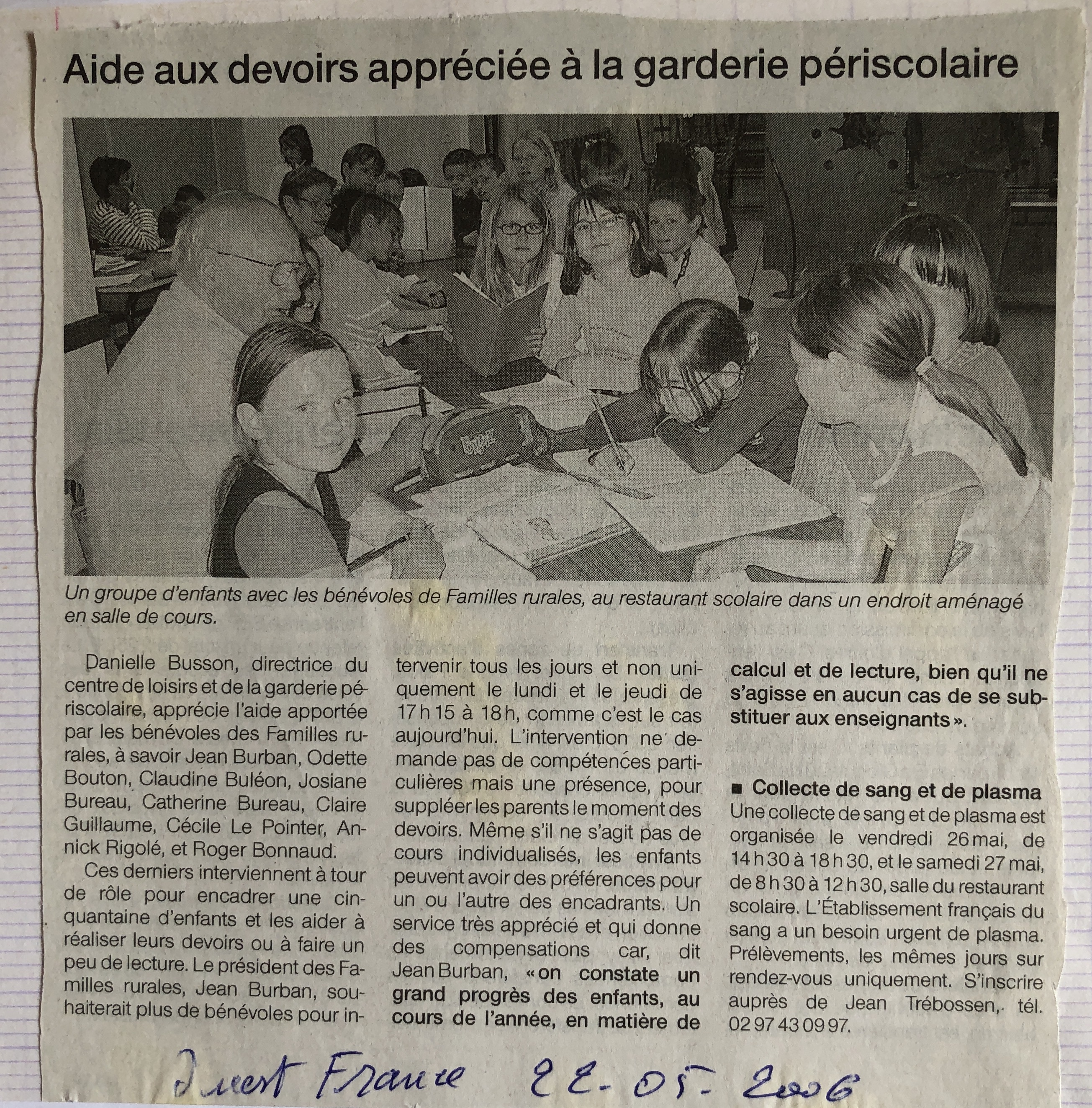 Le 29 juin 2000, une petite fête est donnée pour le départ de Pierrette Le Bouquin après 15 ans de service à la garderie périscolaire, très appréciée par les enfants, rigoureuse mais très bonne éducatrice.