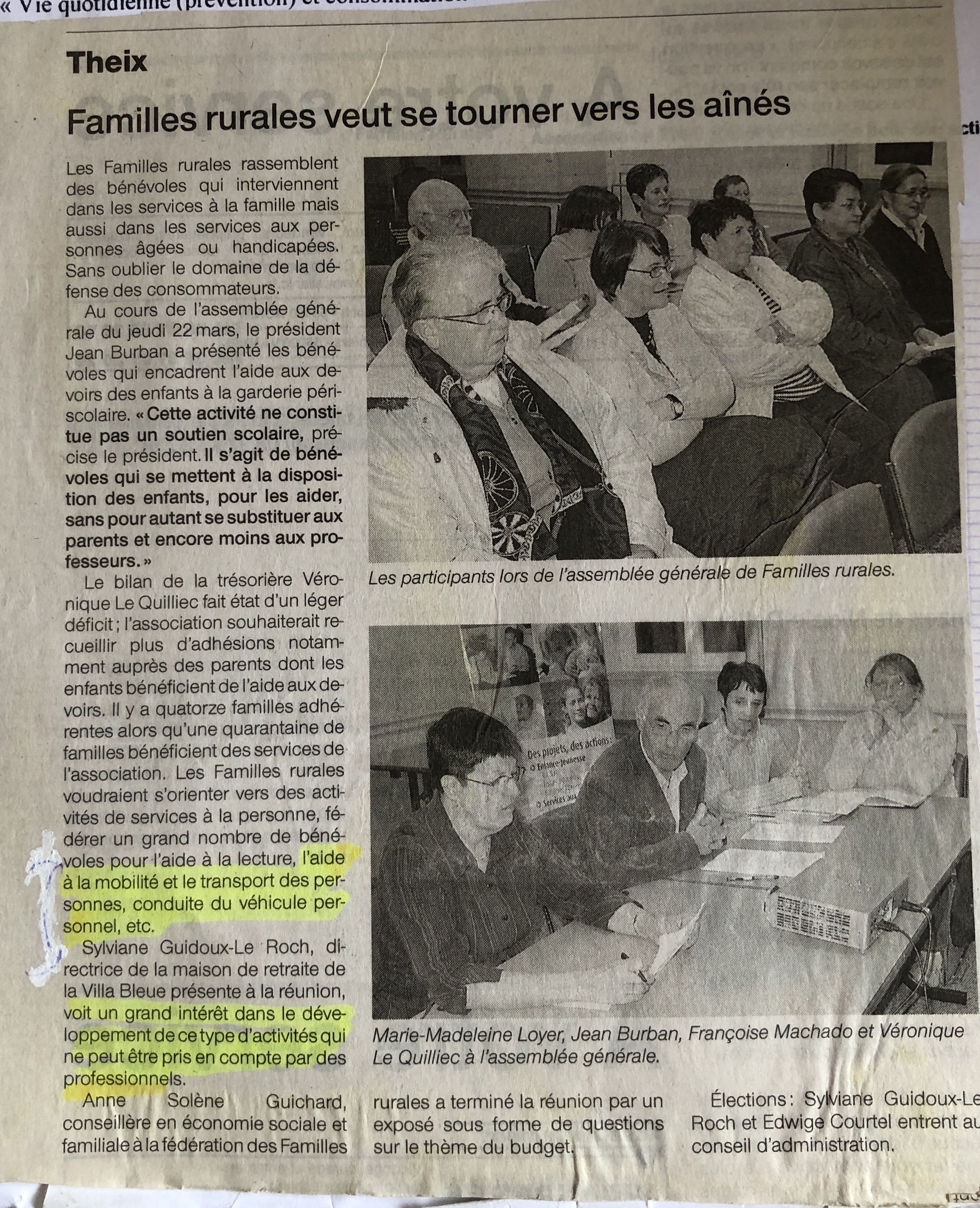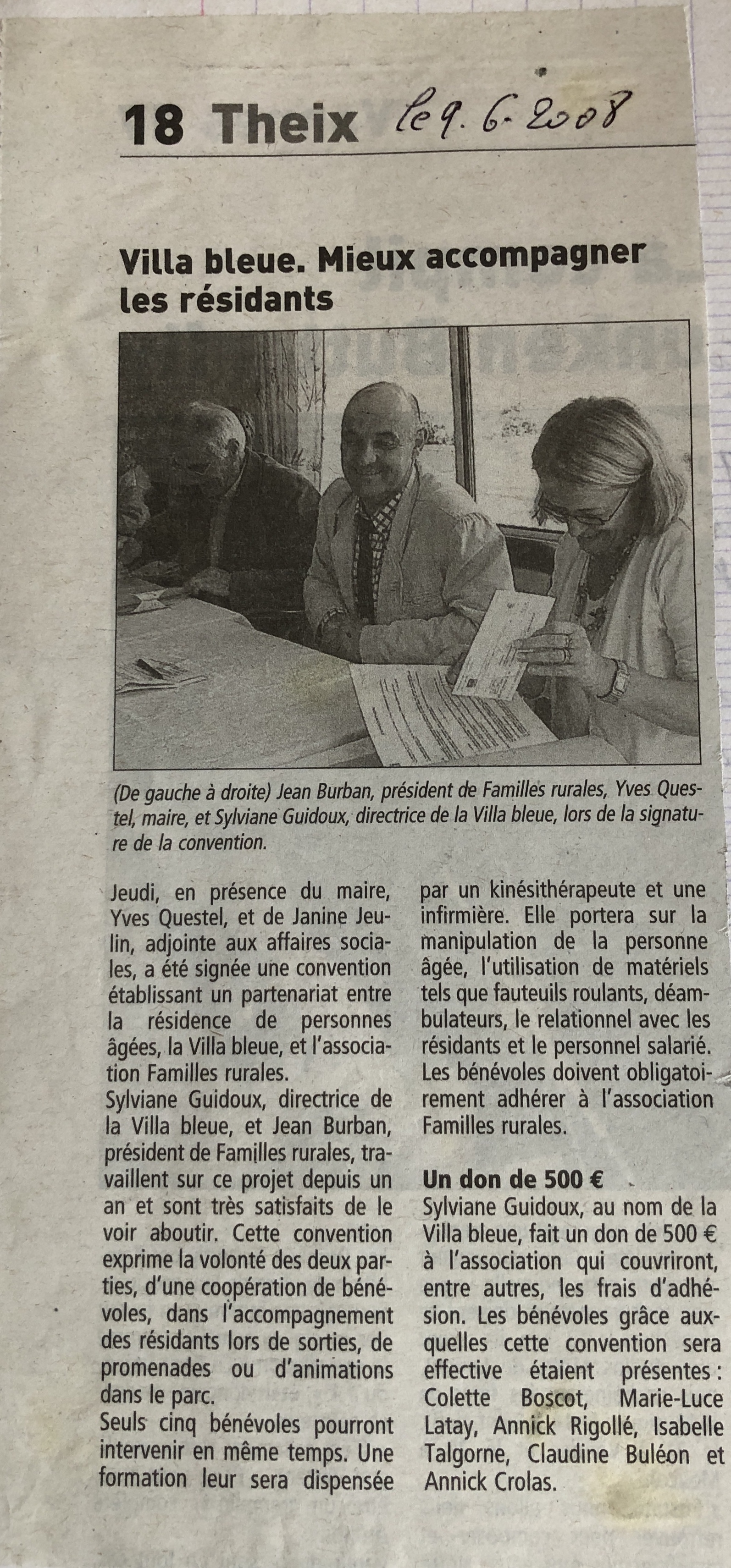 En octobre 2007, une convention est signée entre l'EHPAD, La Villa Bleue (Directrice Madame Guidoux) et Familles Rurales pour l'intervention de bénévoles dans la résidence afin d'apporter une présence extérieure auprès des ainés
