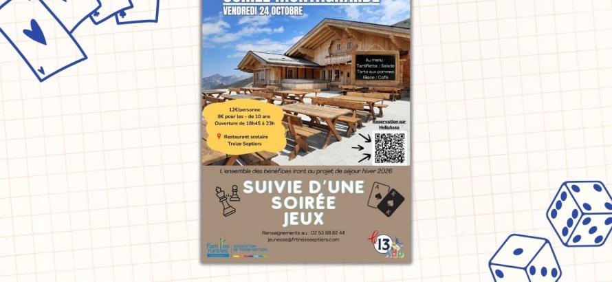 Nous avons le plaisir de vous convier à notre soirée montagnarde, qui se tiendra le vendredi 24 octobre 2025 au restaurant scolaire de Treize Septiers : 3 rue du Menhir 85600 Treize Septiers