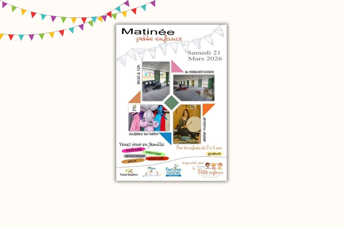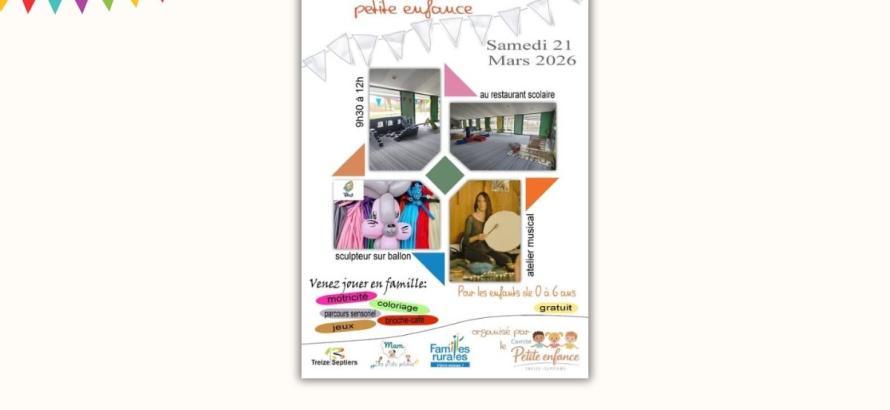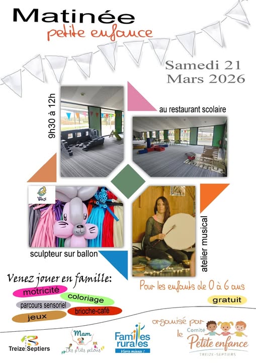 - Une matinée « moments partagés parents enfants » (pour les enfants de 0-6 ans) avec atelier musical, parcours motricité et sculpteur de ballons... le Samedi 21 mars au restaurant scolaire de Treize-Septiers.