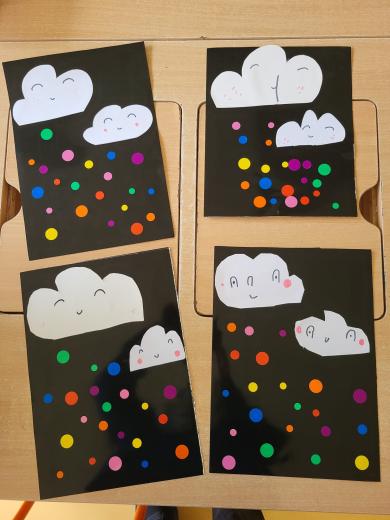 Les Chats aux yeux qui bougent des grands Les nuages et la pluie multicolore des petits