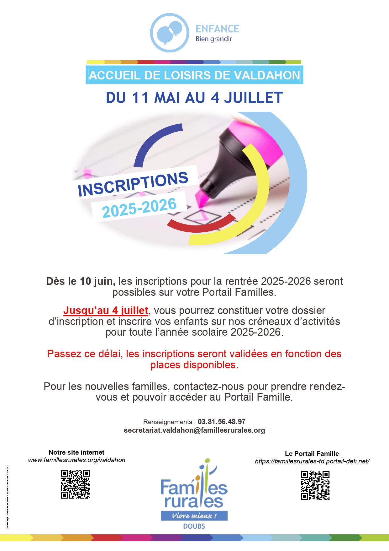 LES DOSSIERS D'INSCRIPTION DE L'ACCUEIL DE LOISIRS DE VALDAHON POUR LA RENTRÉE 2025-2026 SONT DESORMAIS EN LIGNE SUR LE PORTAIL FAMILLES. 28 mai 2025 au 31 août 2023 Fichier(s) inscription_2025-2026_20250528.pdf393.79 Ko