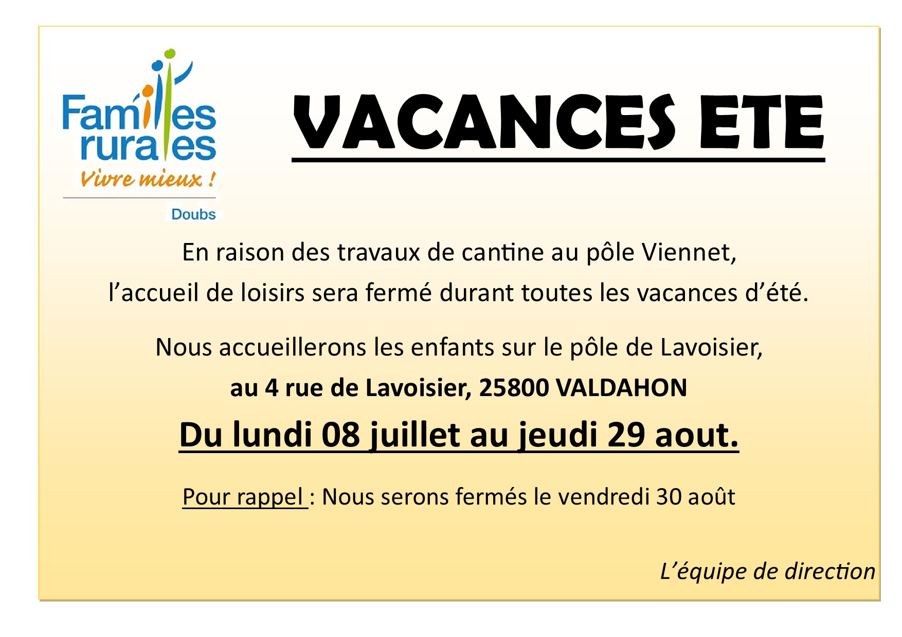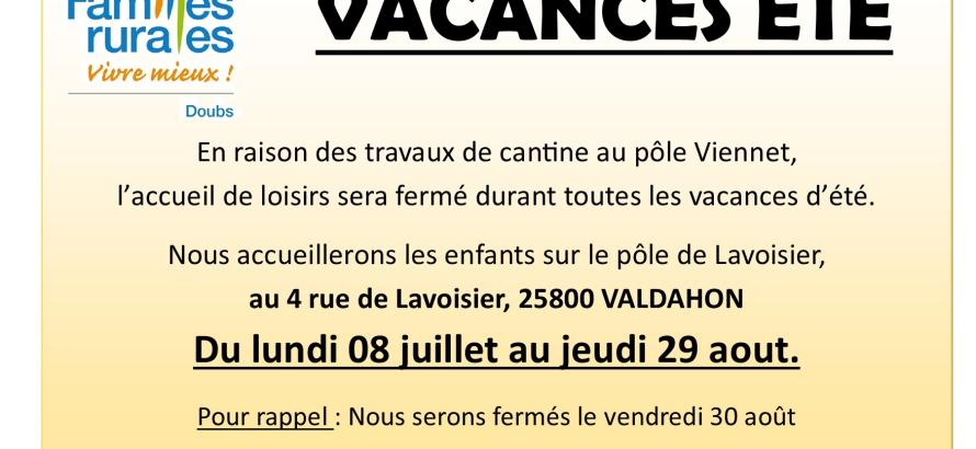 L’accueil de loisirs sera fermé durant toutes les vacances d’été, l'accueil se fera au pôle LAVOISIER