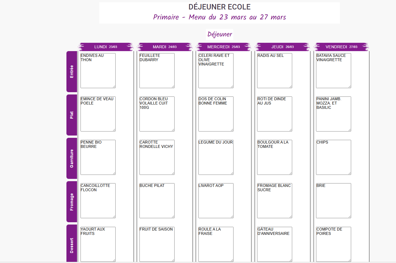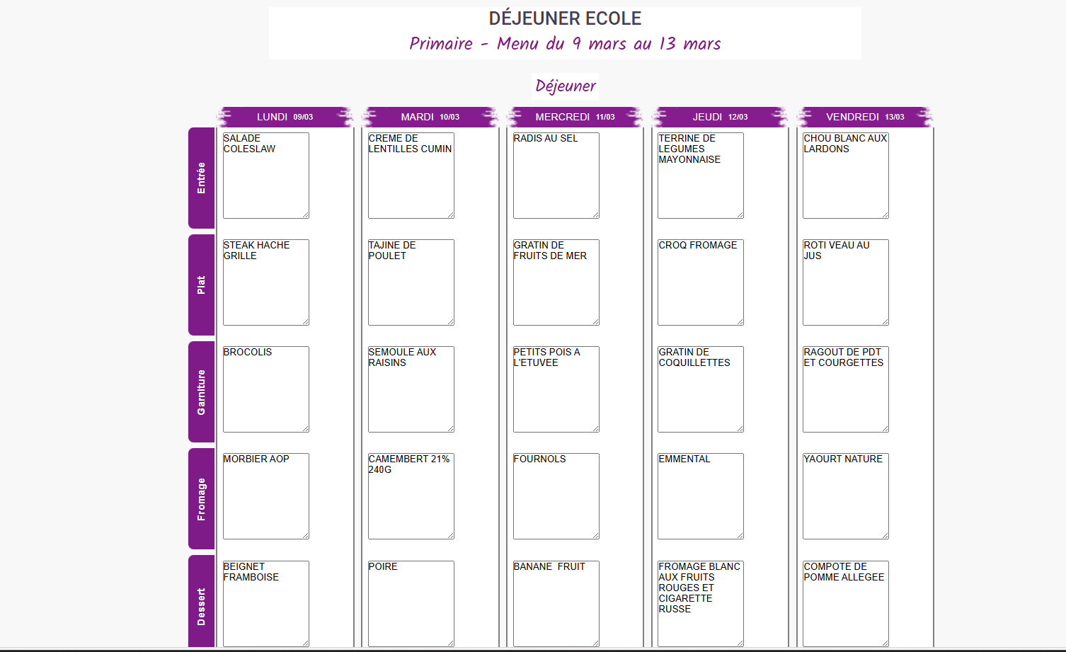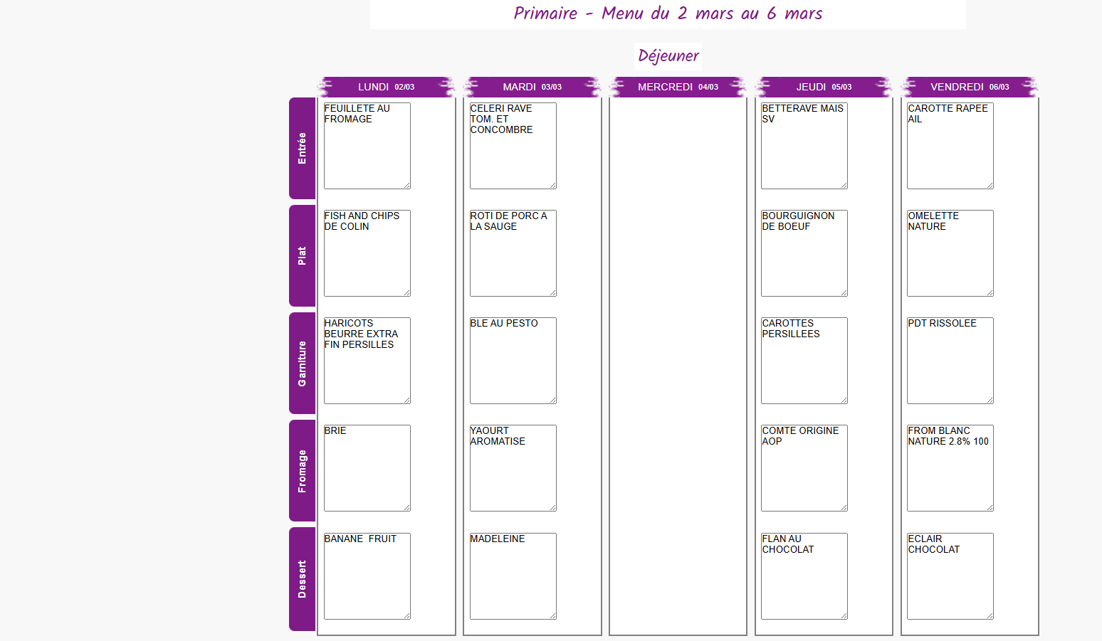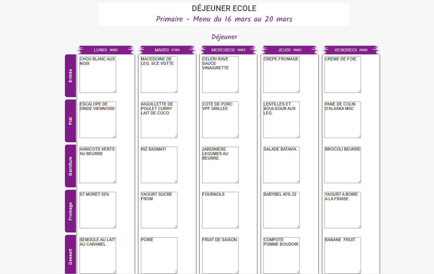 Vous trouverez ci-dessous les menus proposés à vos enfants dans les cantines de Mouthe et Chaux-Neuve. Semaine du 2 au 6 Mars Semaine du 9 au 13 Mars Semaine du 16 au 20 Mars Semaine du 23 au 27 Mars