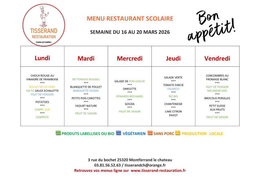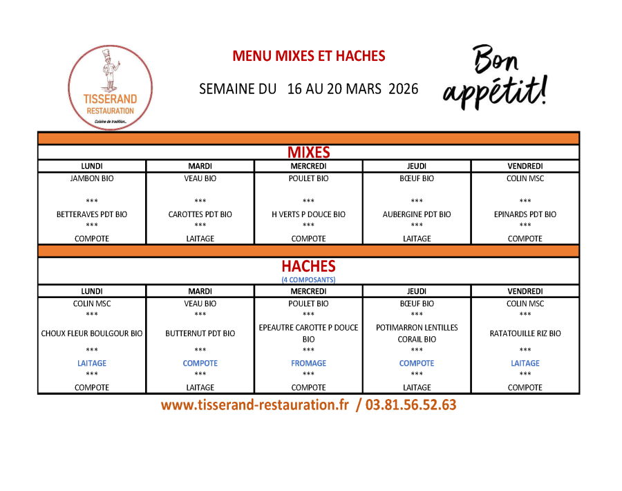 Nous sommes ravis de vous informer que les repas de vos enfants, sont préparés par Tisserand Restauration, un traiteur basé à Besançon, spécialisé dans la restauration périscolaire.