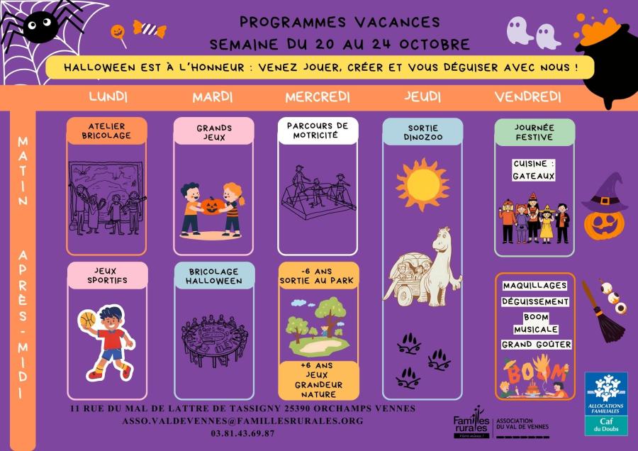 Toute l'équipe de l'Association Familles Rurales du Val de Vennes a le plaisir de vous annoncer l'ouverture des inscriptions pour les vacances d'octobre, qui se déroulera du 20 au 24 octobre 2025.