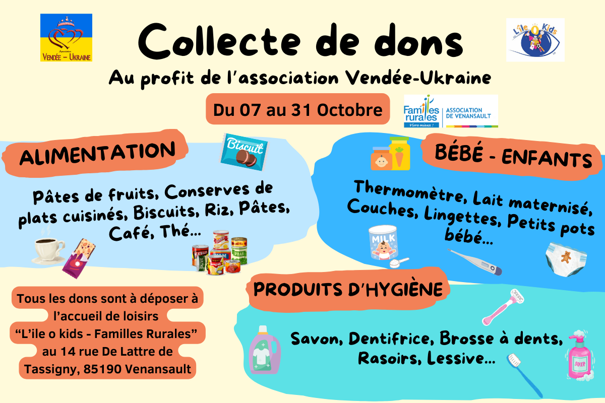 Dans le cadre de la journée mondiale des Nations Unies, l'accueil de loisirs organise une collecte de dons au profit de l'association Vendée-Ukraine.