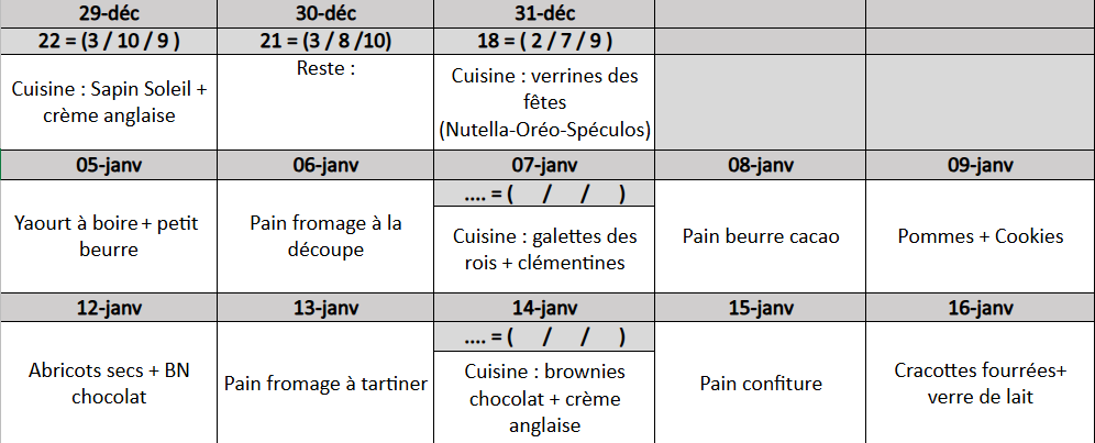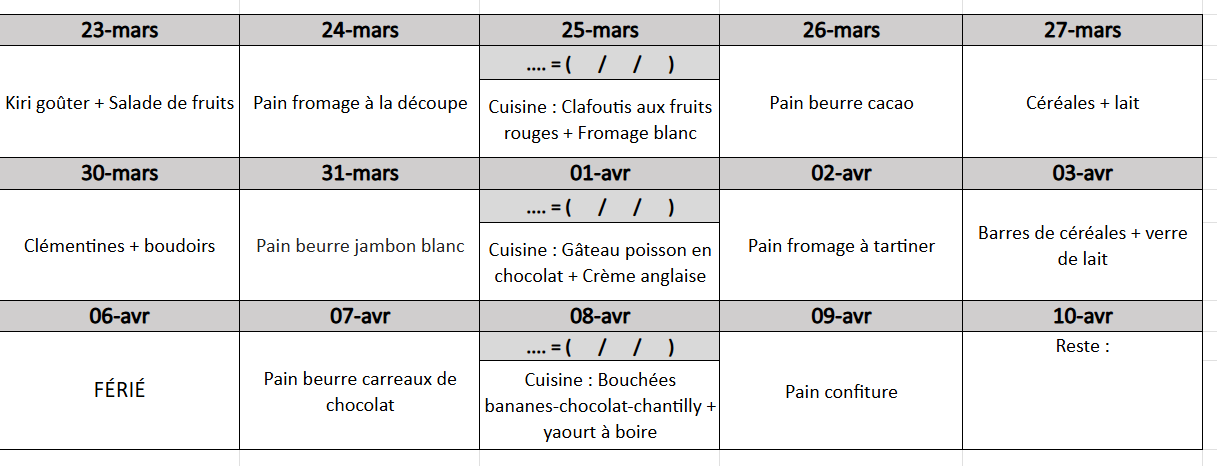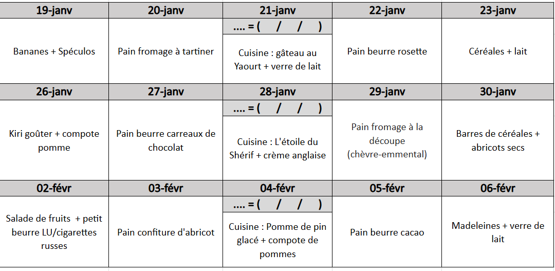 Le planning des goûters est élaboré afin de respecter au maximum l’équilibre alimentaire des enfants en fonction des repas prévus au restaurant scolaire le midi. Afin de proposer un goûter adapté aux besoins de l'enfant, nous nous appuyons sur les recommandations d'une diététicienne.