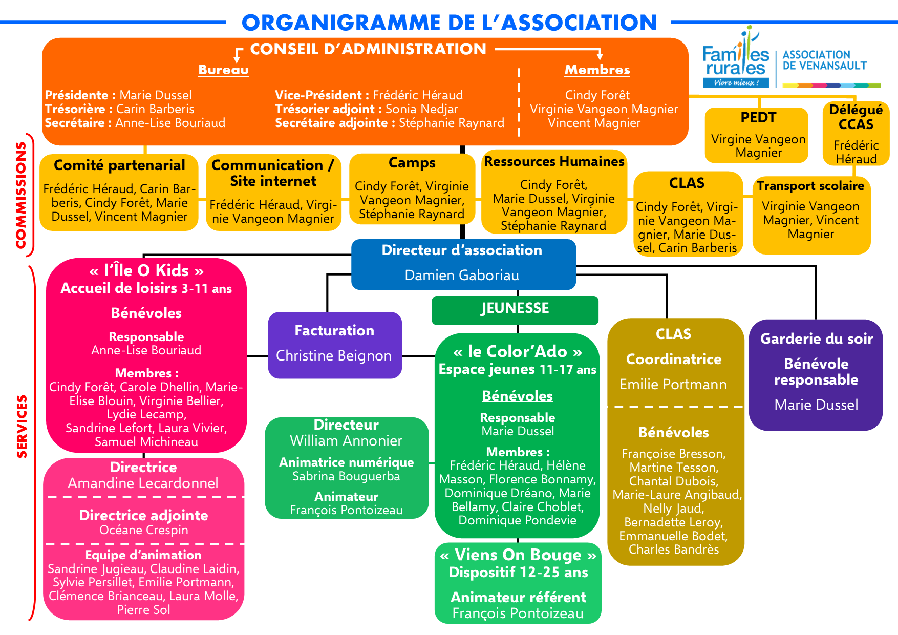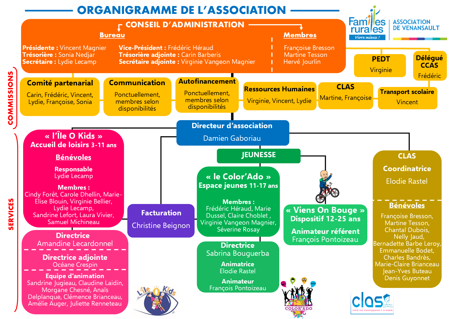 Ci-dessous, vous trouverez l'organigramme afin de mieux comprendre le fonctionnement de l'association, l'articulation entre bénévoles et salariés.